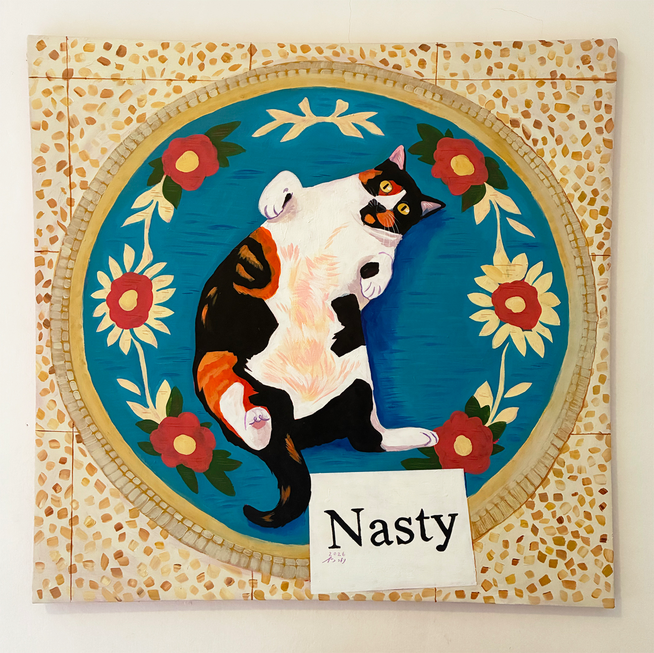 חתולה טריקולורית בשם פיצה, על שטיח פרחוני, ברקע אריחי טראצו