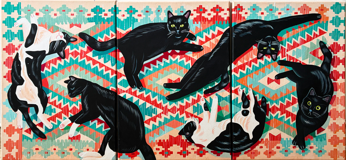 טריפטיך חתולים על שטיח גאומטרי - 3 קנבסים כל אחד בגודל 35 על 50 ס״מ, כאשר הם ביחד הם בגודל 105 על 50 ס״מ, נמכרים ביחד.