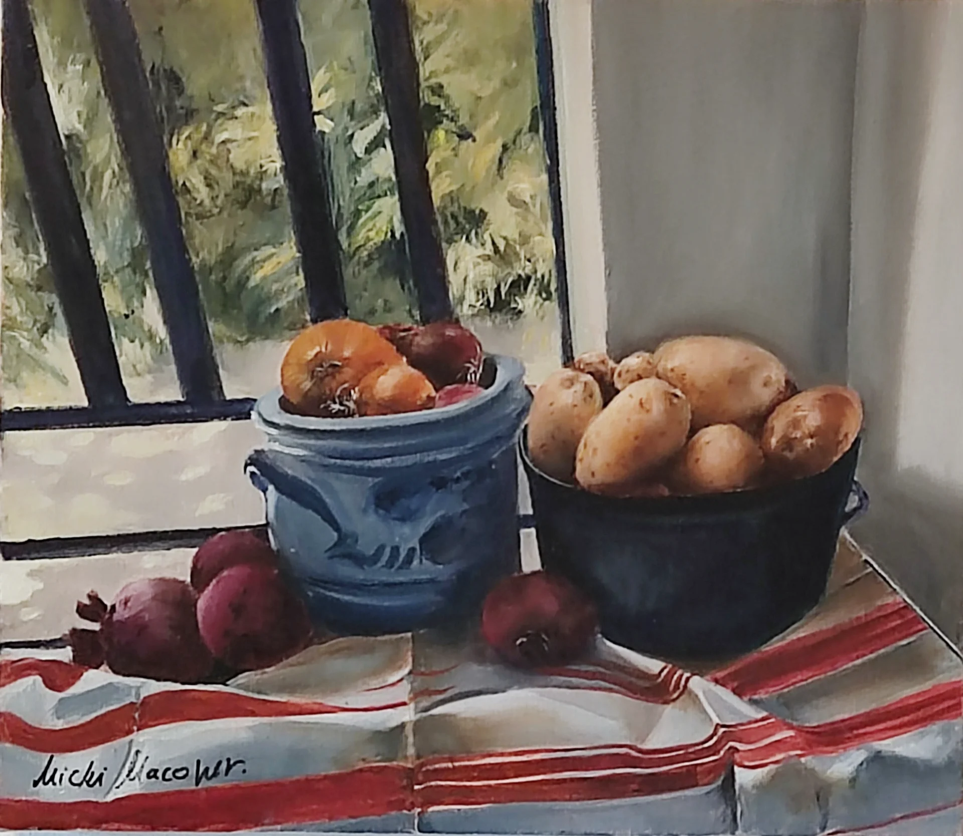 An intimate still life unfolding on a sunlit windowsill. On a white cloth with red stripes sit two vessels: a blue ceramic bowl filled with red and golden onions, and a deep dark pot brimming with pale potatoes. Scattered around them are additional onions and pomegranates, adding warm color spots that emphasize the natural textures of the peels. Through the window bars, a blurred green background peers in, creating a contrast between the defined, warm interior and the soft, abstracted exterior. The painting is characterized by delicate realism, precise plays of light and shadow, and a quiet, domestic atmosphere full of presence.