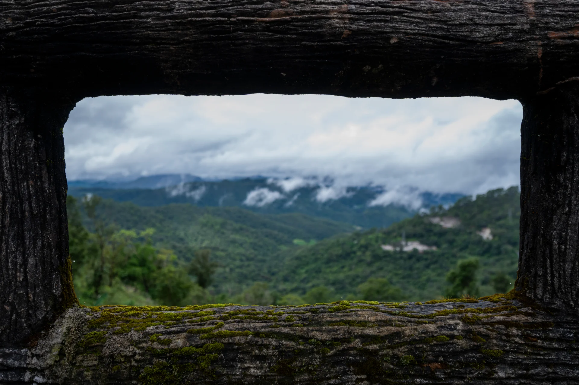 An old stone wall at a viewpoint in the Pai area of Northern Thailand steals the show from the stunning panoramic landscape, creating a picture within a picture