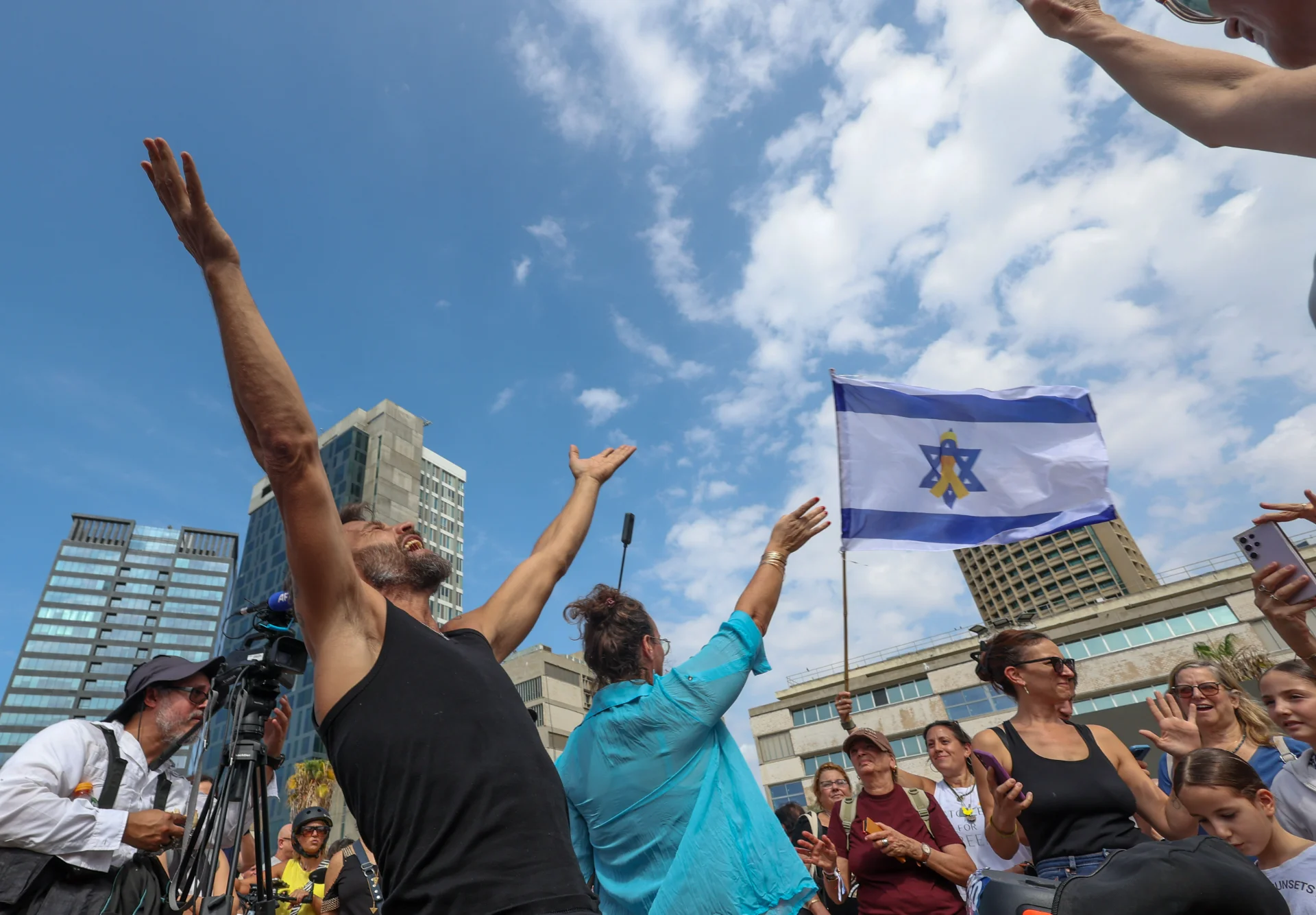 A crowd gathers at Hostages Square in a charged yet liberating moment following the announcement of the end of the โIron Swordsโ war. Arms are raised toward the sky, the Israeli flag waves in the wind, and faces reflect relief, joy, and renewed hope. The urban skyline forms a backdrop to a living civic reality, where the street becomes a stage for collective emotion. The photograph captures a deeply human instant of release a deep breath after a prolonged period of tension and uncertainty