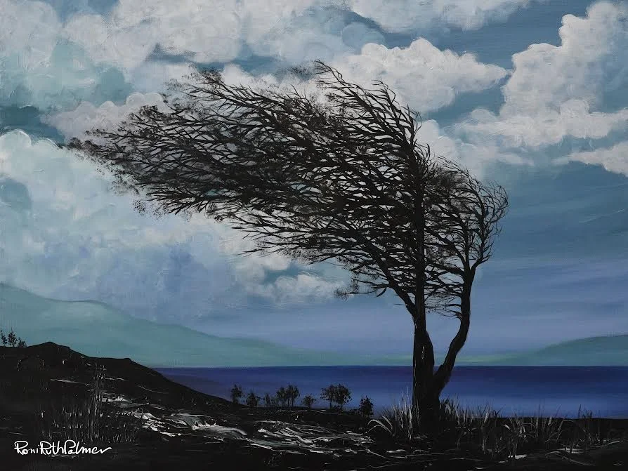 Original painting of a tree leaning to one side in a strong wind, a cloudy and gloomy day