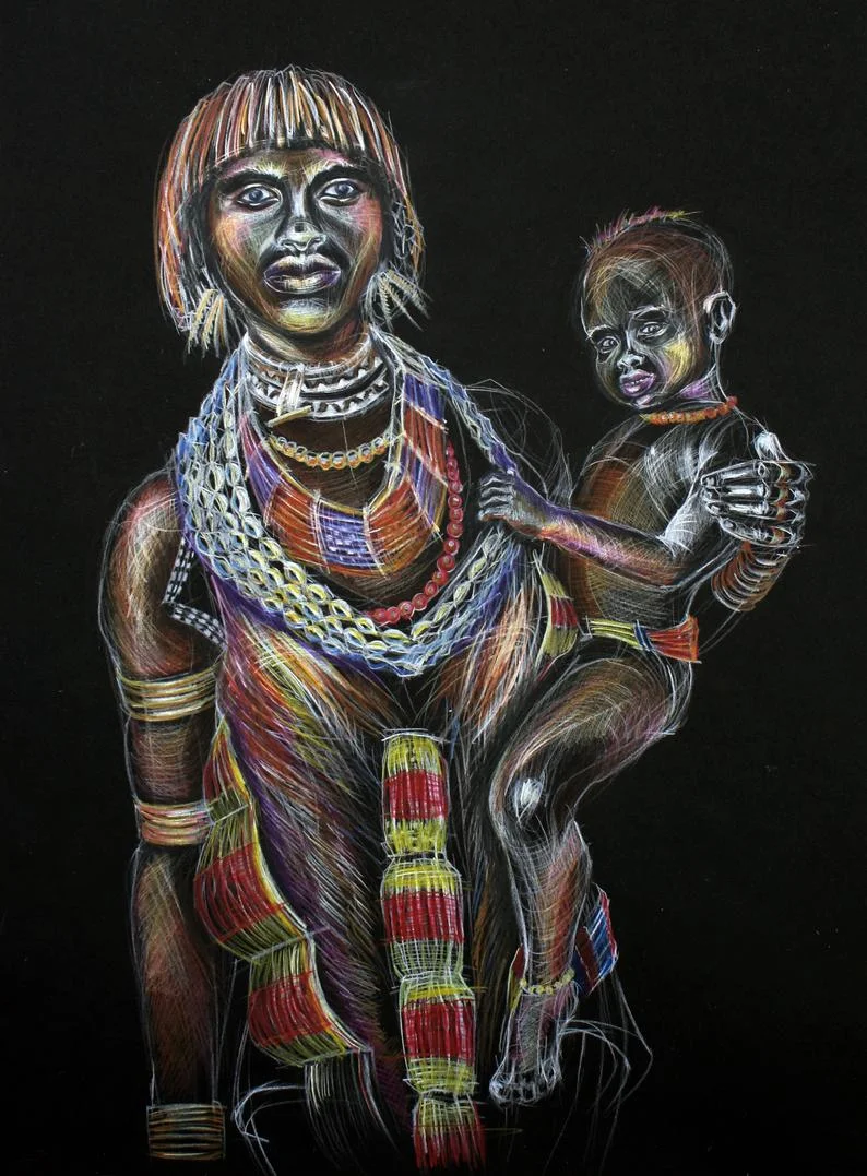 This drawing is inspired by my travels in Africa and celebrates the beauty of authentic African cultures and the strength of motherhood.
