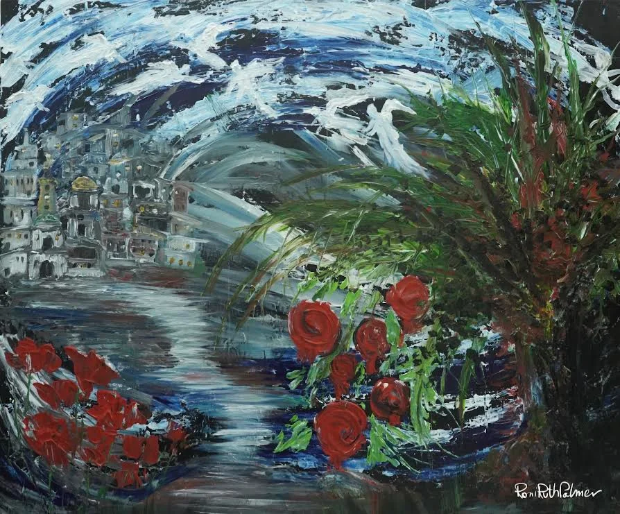 Original mixed media painting with brush and spatula, of angels in the sky above town houses and a pomegranate tree symbolizing happiness