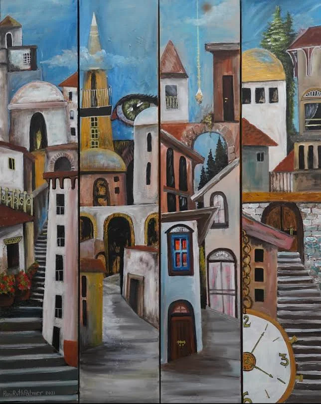 Alleys and stairs lead to the houses of the old city. Towers and symbols within the painting like a large clock, an eye looking over the city, but a treasure hanging above. Symbols of a city or village with ancient oriental buildings