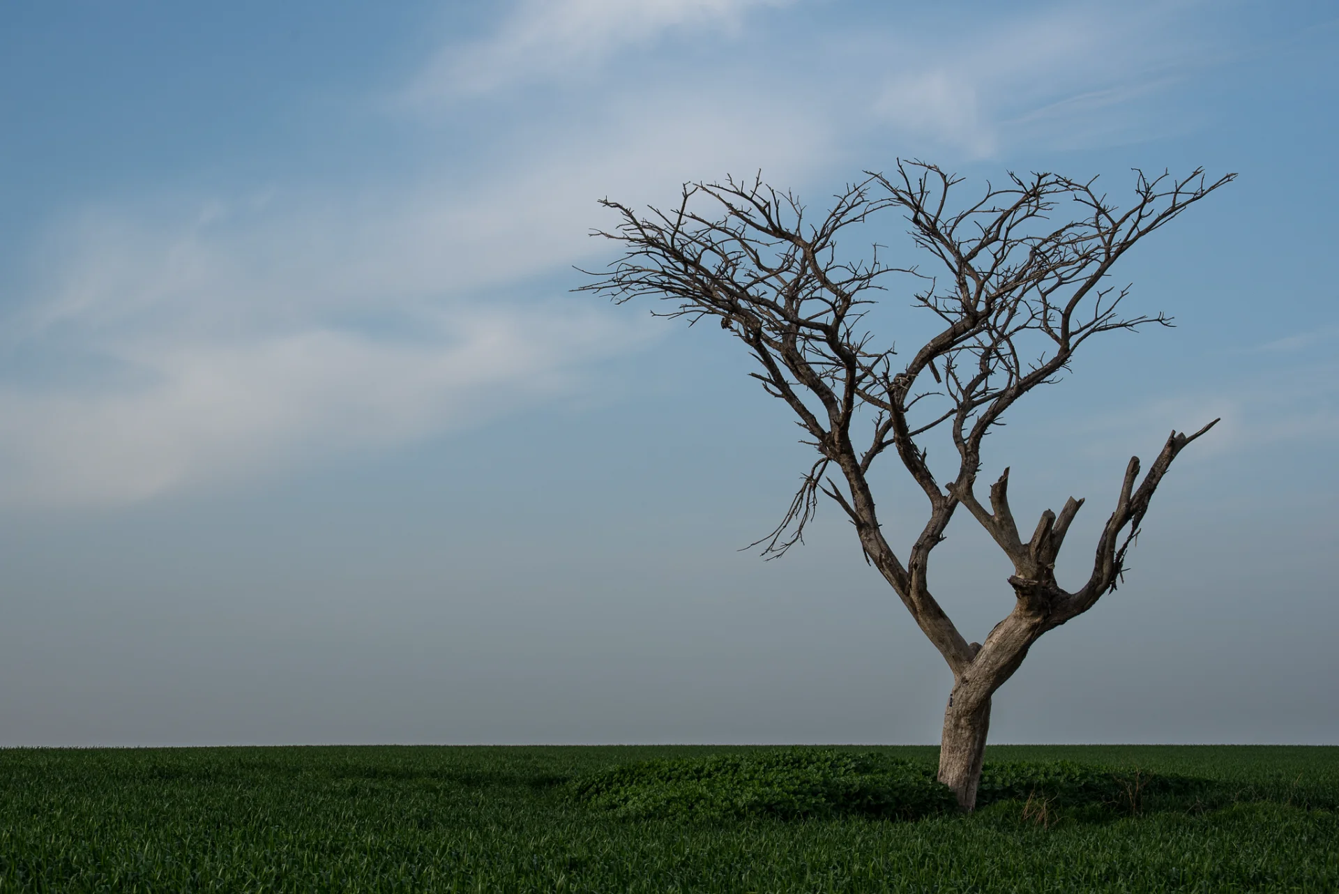 A minimalist photographic work depicting a solitary leafless tree against an open sky, exploring themes of isolation, silence, and resilience through restrained composition and natural light.