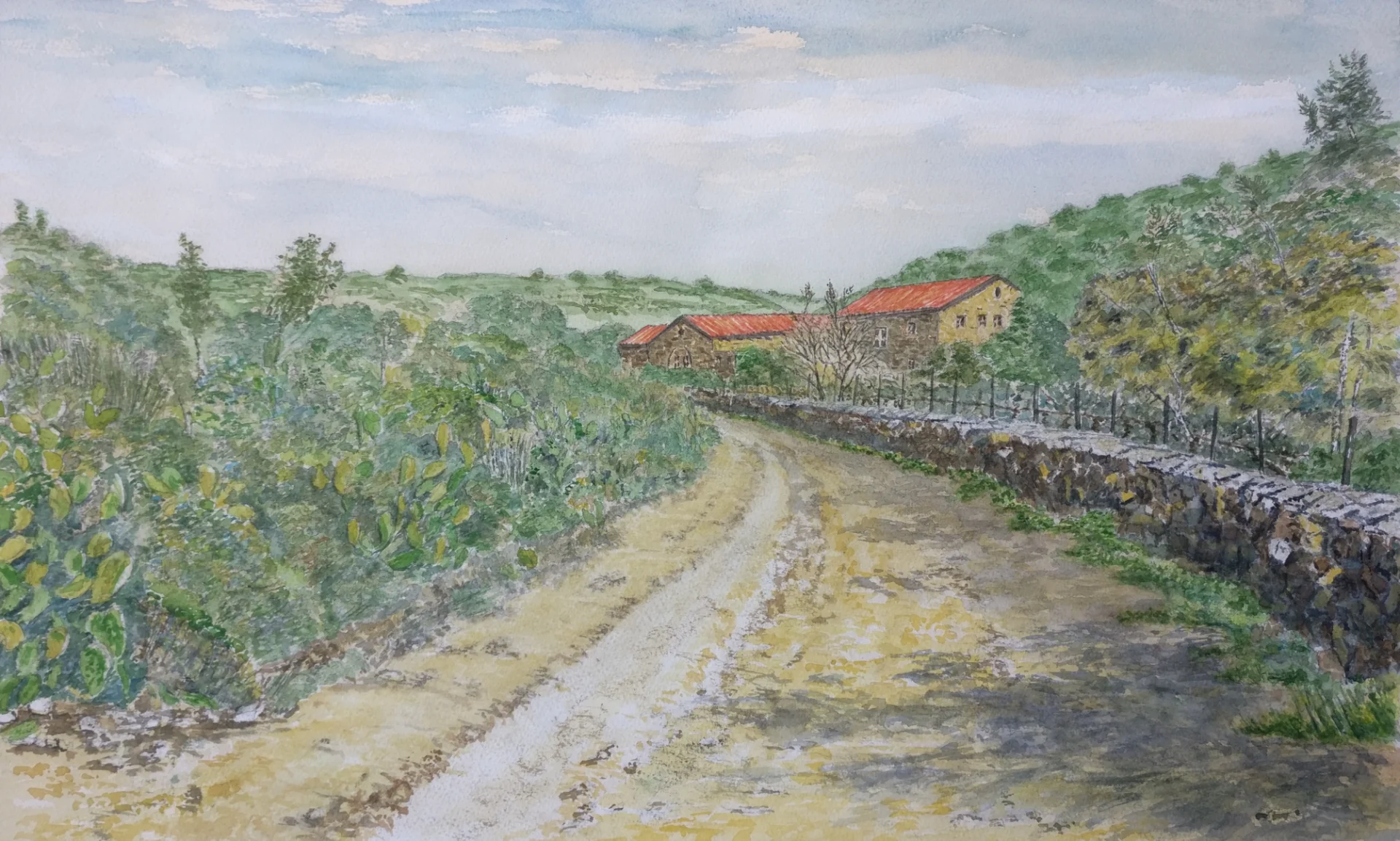 Watercolor painting on paper of the Amphora Winery next to the Maharal Vineyard on Mount Carmel