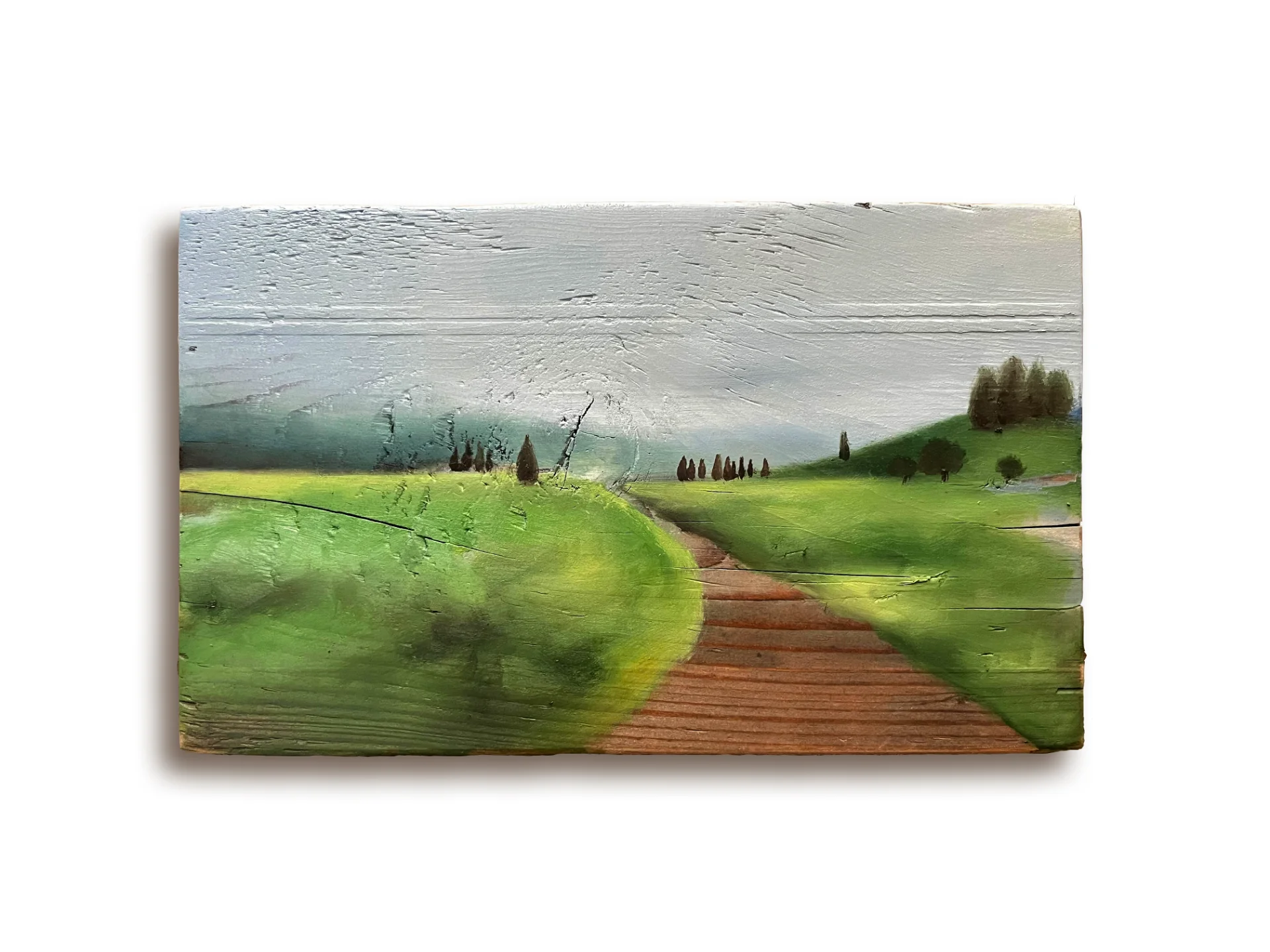 An oil painting on a wooden panel, depicting a road that passes through green hills towards the next horizon. A picture that holds the hope of a renewed outlook.