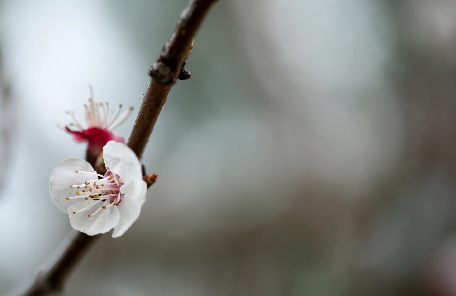 A single apricot blossom emerges gently against a soft, blurred background. Delicate shades of grey and pink create a quiet, airy atmosphere, where the flower appears almost suspended within the surrounding light.