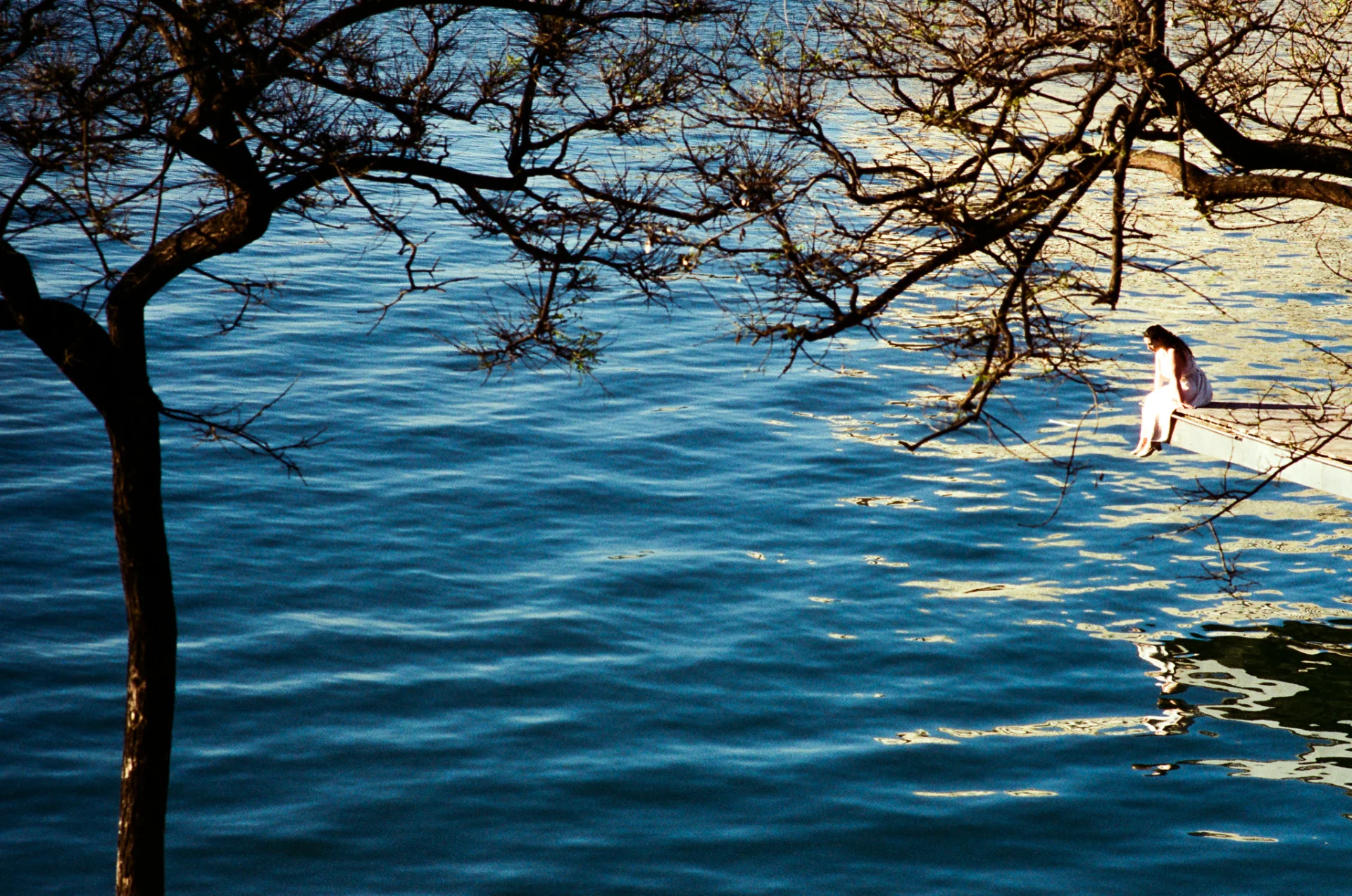A solitary figure sits at the edge of the water, suspended between presence and reflection. Framed by branches and surrounded by shifting light, the scene captures a moment of stillness within the movement of the surface. Photographed on film in Barcelona, the image explores solitude, distance, and the quiet space where the inner world meets the landscape.