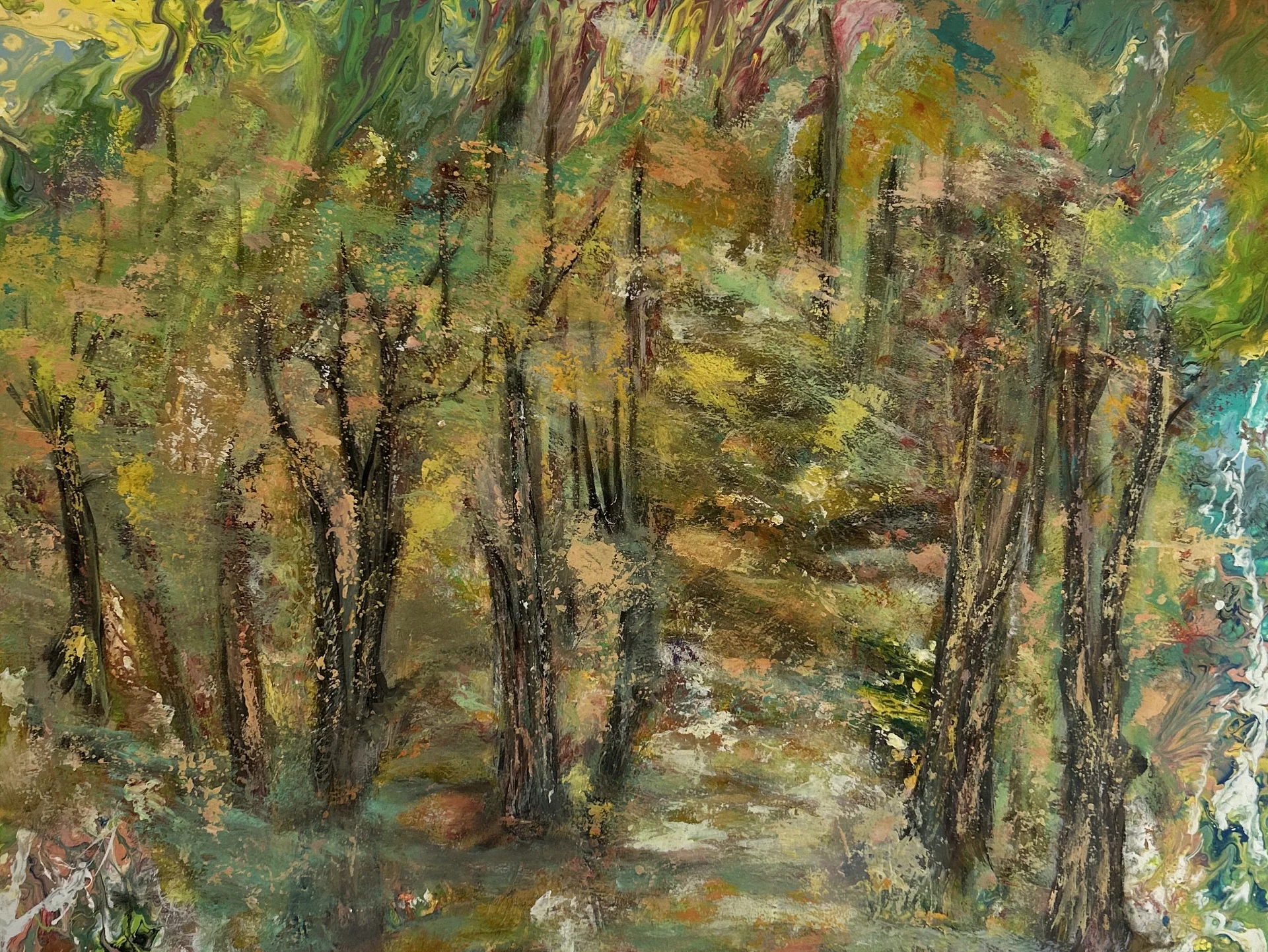 An atmospheric forest composition inspired by the colors and transitions of autumn. Layered brushwork, fluid textures, and earthy greens, golds, and browns create a sense of movement, depth, and quiet immersion in nature.