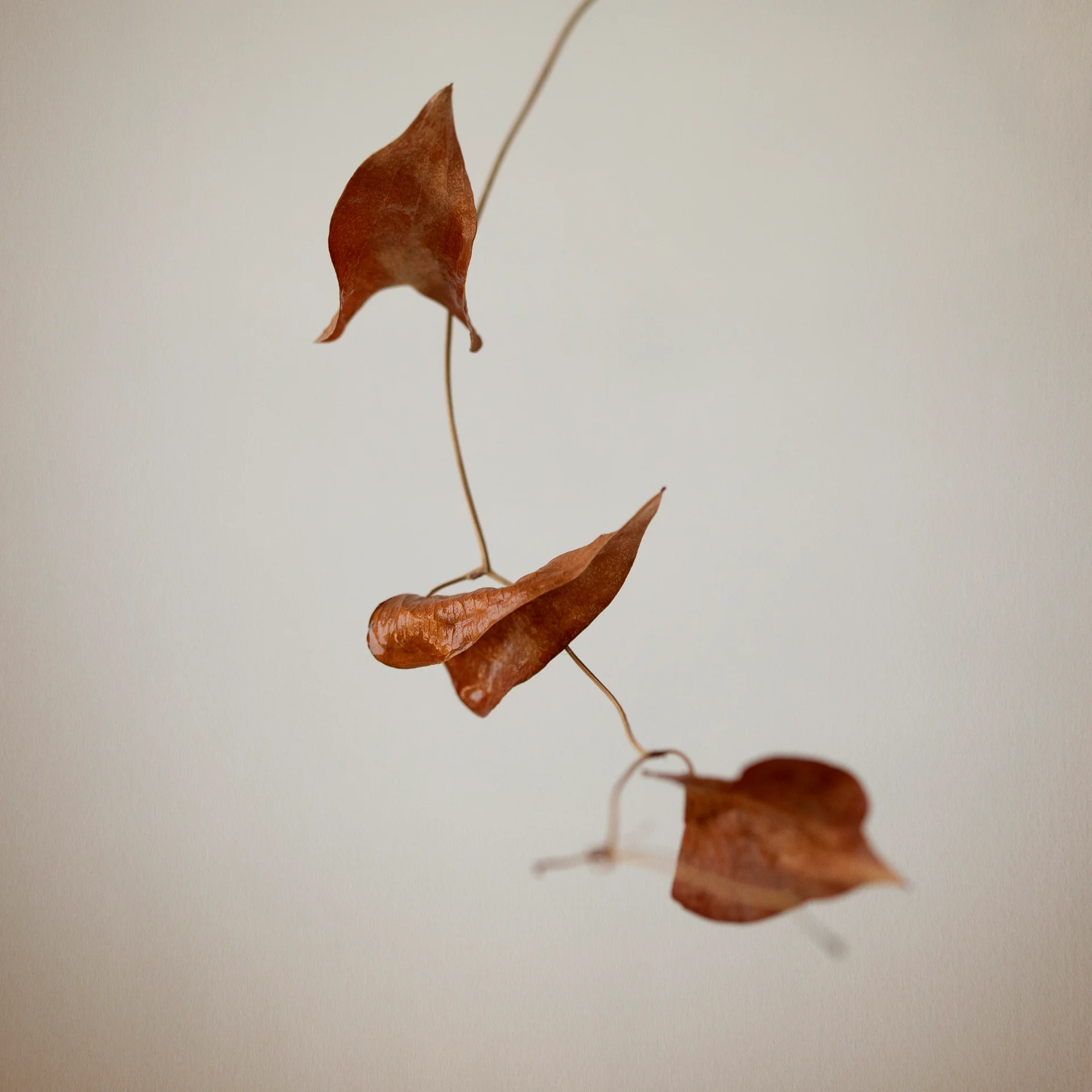 Three dried leaves in warm orange-brown tones rest against a soft, light background. One leaf stands in sharp focus while the others gently fade into blur, creating a minimalist composition that captures the quiet movement and grace of autumn.