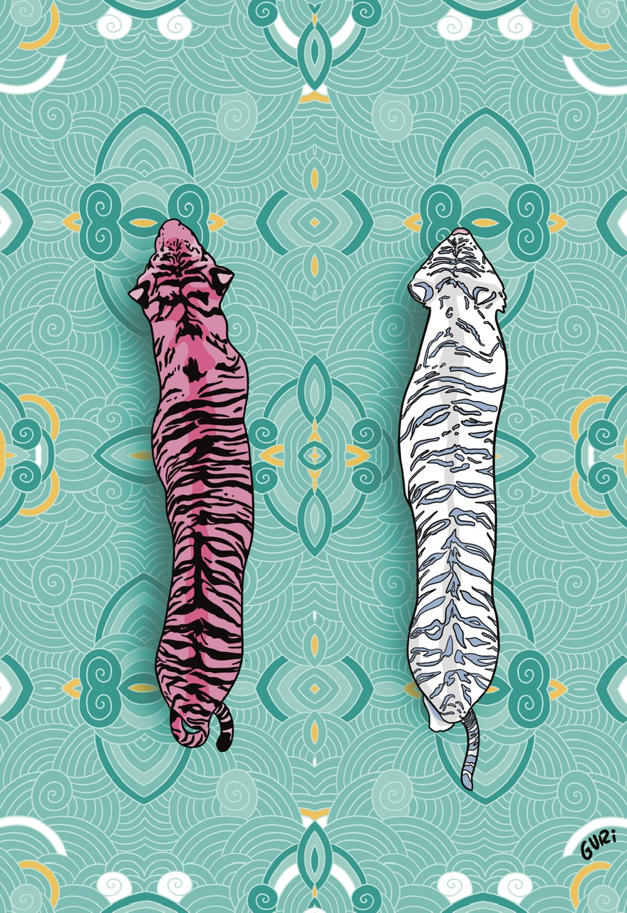 Two tigers, two living entities, lie side by side in a symmetrical world - a mirror of differences within sameness. The artwork explores inner contrasts: strength and softness, wildness and grace, identity and choice. It offers a moment of balance between opposites, reminding us that harmony is born precisely where they meet.