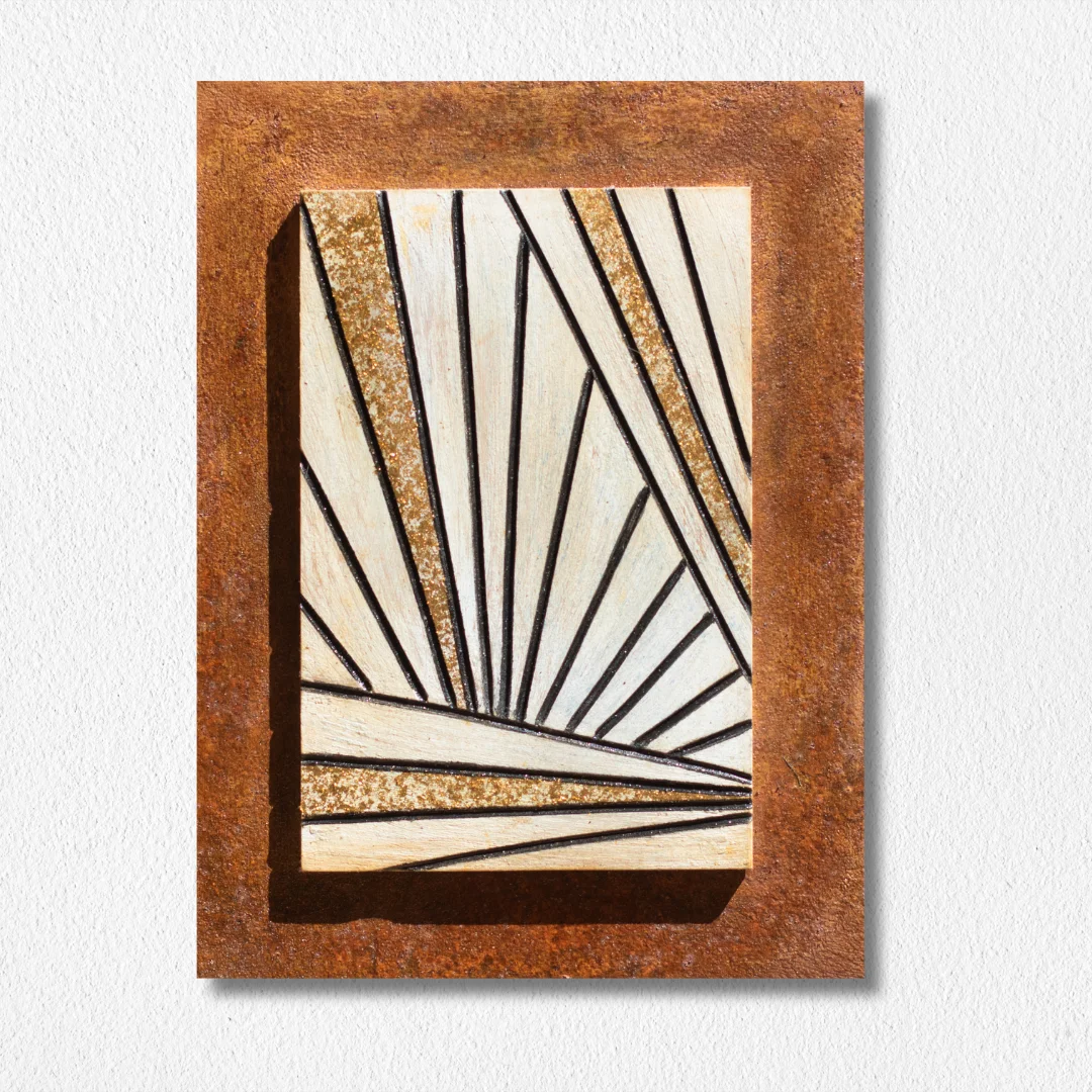 A work that combines rusty iron, wood with engravings and gold flakes