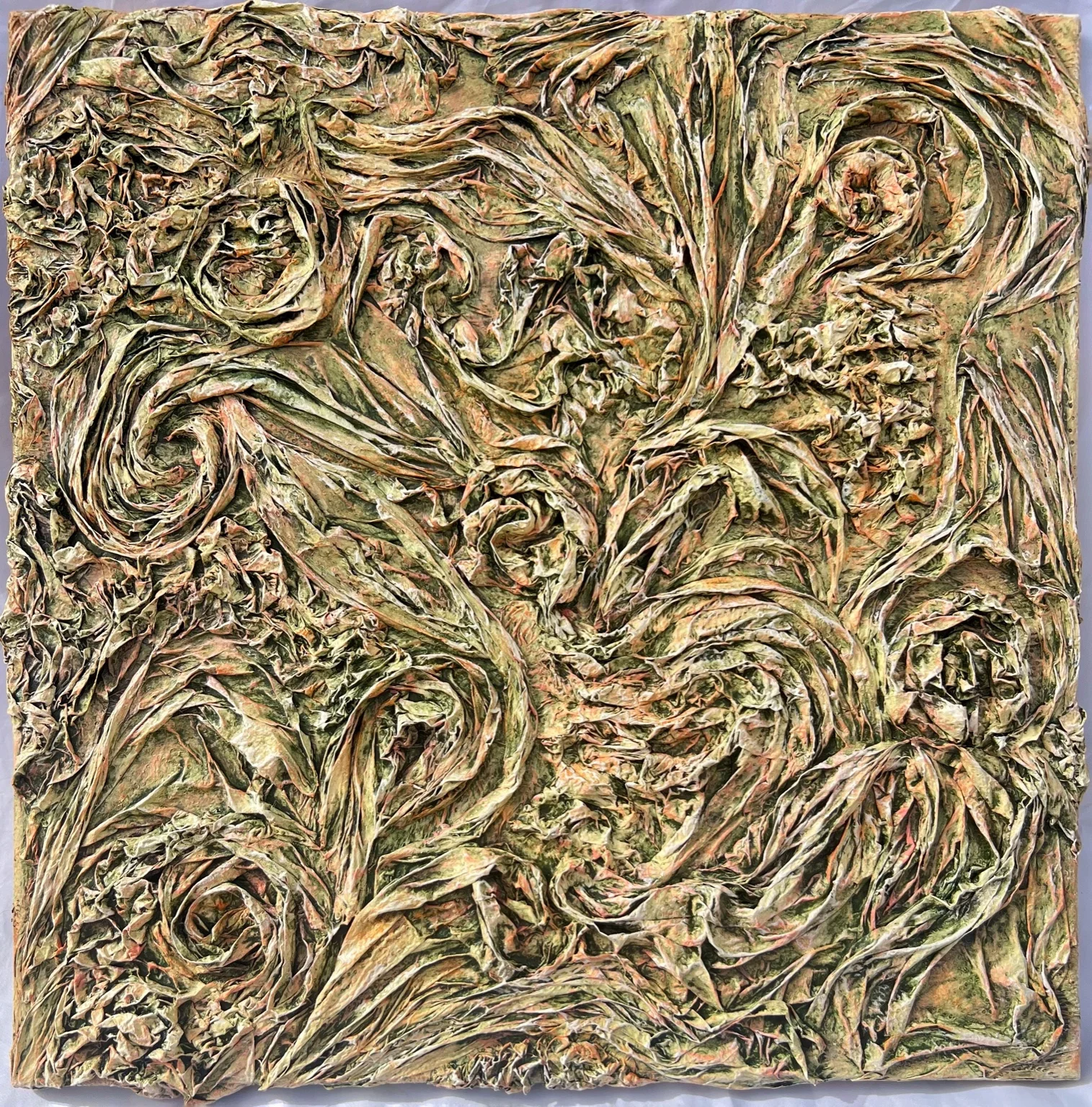 This piece was created in a moment of relative quiet. On the surface, there is a sense of breath, of stabilization, of movement that has softened. Yet beneath the surface, the layers are not smooth. Folds, currents, and grooves continue to exist โ like memory that does not disappear even when the body learns to stand again. The relief is built from accumulated layers of papier-mรขchรฉ, collected, folded, and compressed one upon another, creating a space where outward calm coexists with inner tension. It is a space where breathing is possible โ yet the scars remain. Textures and colors hold the tension between what appears on the surface and what stays deeply imprinted within.