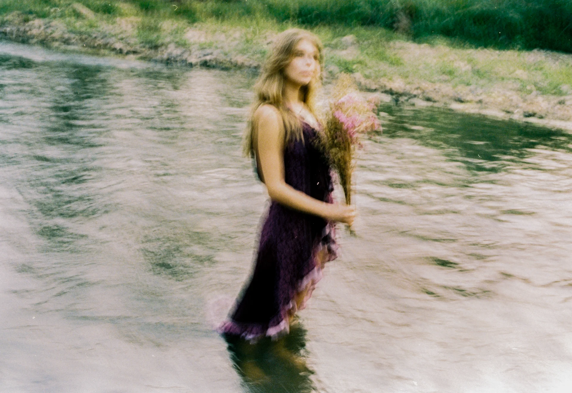 Shot on medium format film in a quiet river in Mae Hong Son, northern Thailand, this image captures a fleeting moment suspended between movement and stillness. A solitary figure stands in the flowing water, holding a bundle of wild flowers, as the current blurs the edges of time and presence. The softness of the film and the gentle motion create a dreamlike atmosphere, where nature, memory, and emotion merge into a quiet, intimate scene.