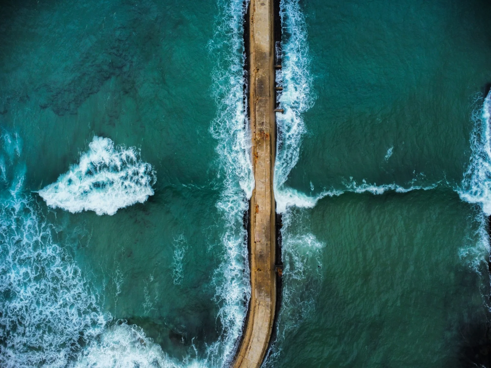From above, a thin, straight breakwater stretches out, with a gentle hint of a curve at its beginning. It cuts through the sea like a line separating storm from calm, war from peace. On one side, the water bursts into white foam, while on the other it settles, flowing in a long, slow, continuous wave. Within all this movement, the breakwater simply continues forward, quiet and steady, not fighting, just connecting two worlds.
