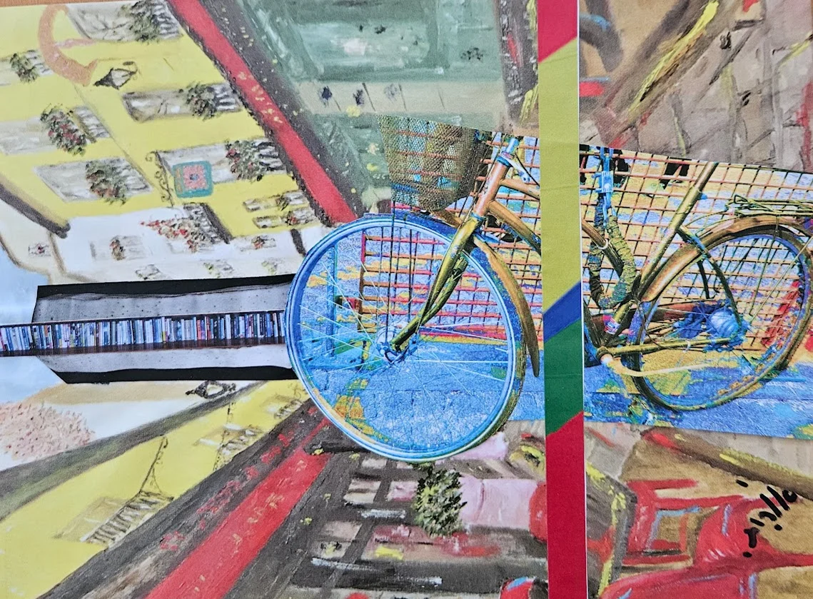 A collage made from magazine paper. It depicts a bicycle passing through an urban alley. The collage can be hung vertically or horizontally as it is based on the principle of reflection.