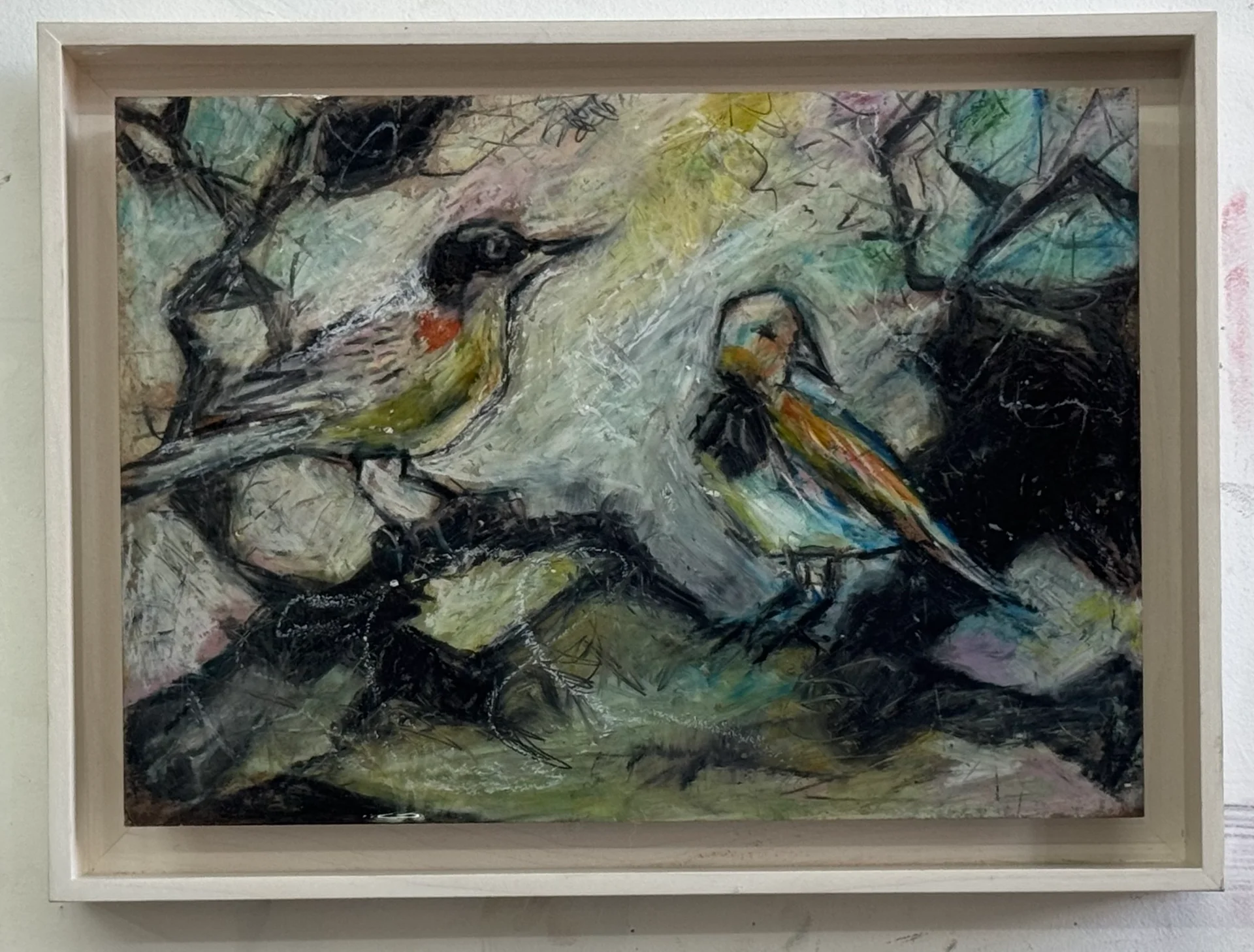 Two paintings that are one work. Can be purchased separately. The price refers to one work from the pair. Framed in a thick white wood frame