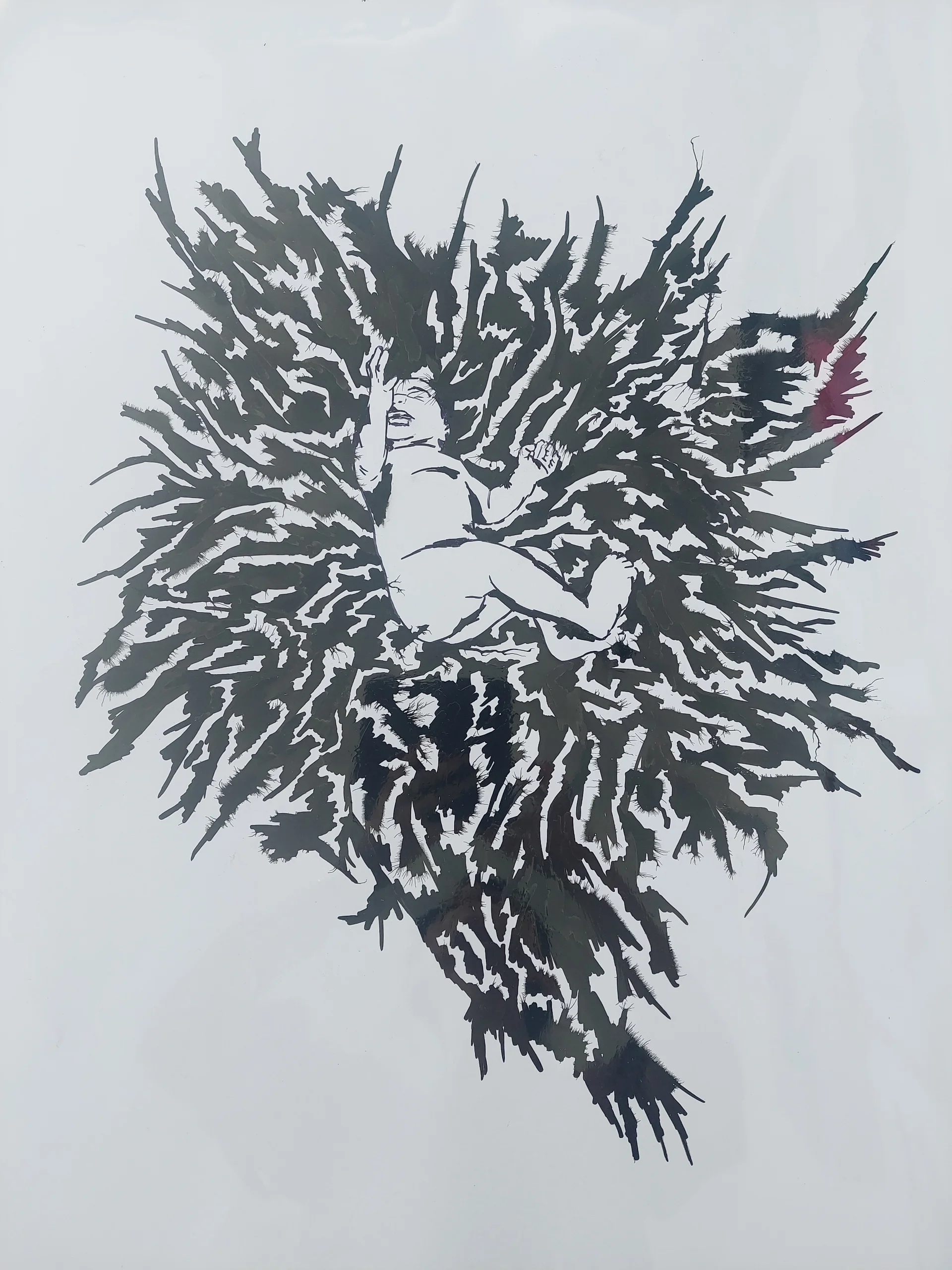 "A baby is born into the world from the enveloping womb, and is immediately required to enter a reality where they are at the mercy of their mother and the environment. Here, using a marker on a transparency, I drew myself at birth, out of the questions: How was I welcomed into the world? What did I feel then? What weaknesses and strengths were built within me from that initial encounter with reality?"