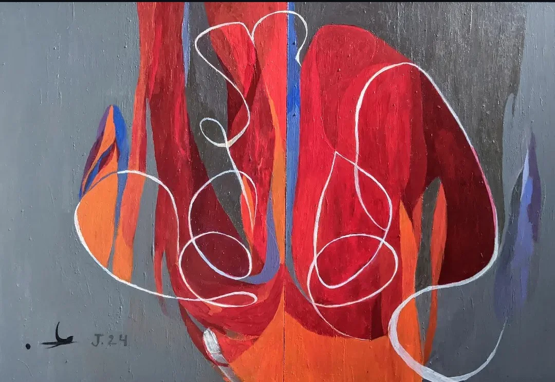 An intensive search between disintegration and new formation. The white line is like a burning coal that has been released and awakens and elevates the event. The work relates to the human heart and consists of two aluminum surfaces suspended side by side. 2023