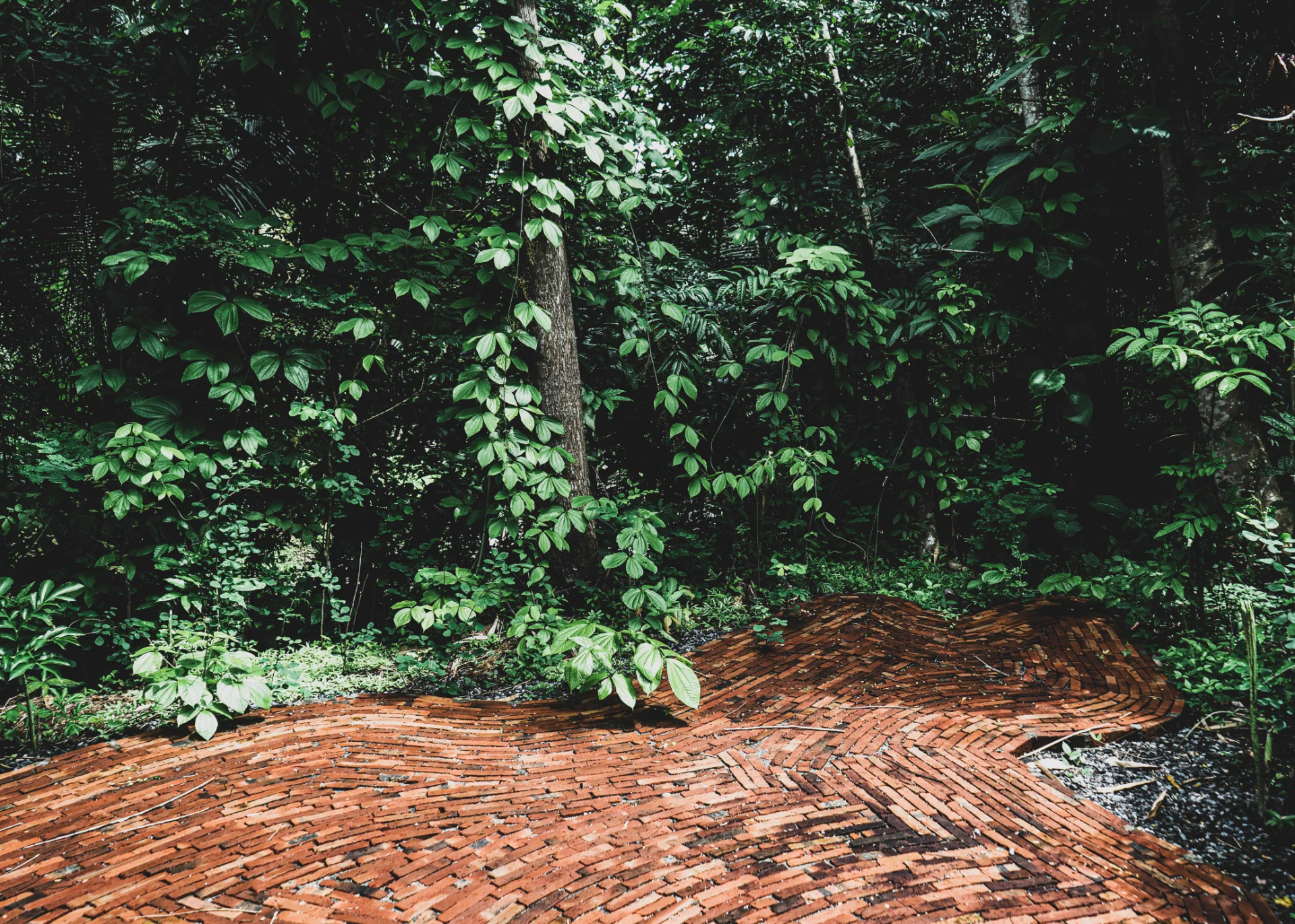 A beautiful red brick terrace designed by Javanese Architect Eko Prawoto, set in his estate in Jogjakarta, Java, Indonesia. the image depicts a beautiful boundry condition between the human and natural worlds.