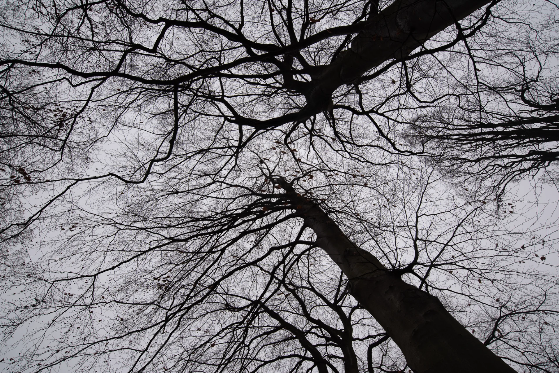 A striking photographic composition looking upward through winter tree canopies, where dark branching lines spread across a pale sky. Printed on paper, the work explores rhythm, structure, and the graphic tension between nature and negative space.