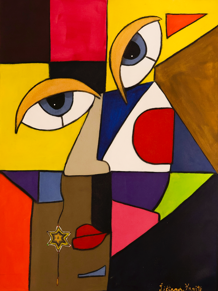 acrylic A face breaks into planes of color, as if identity were viewed from multiple angles. The eyes—one alert, one dreaming—watch and rise. A six-pointed star with a teardrop hangs near the mouth, whispering pain or memory. The piece blends cubism and emotion, revealing a gaze that not only sees but questions. “Eye, You’re in the Spotlight” reminds us that being seen can be exposure, vulnerability, and resistance.