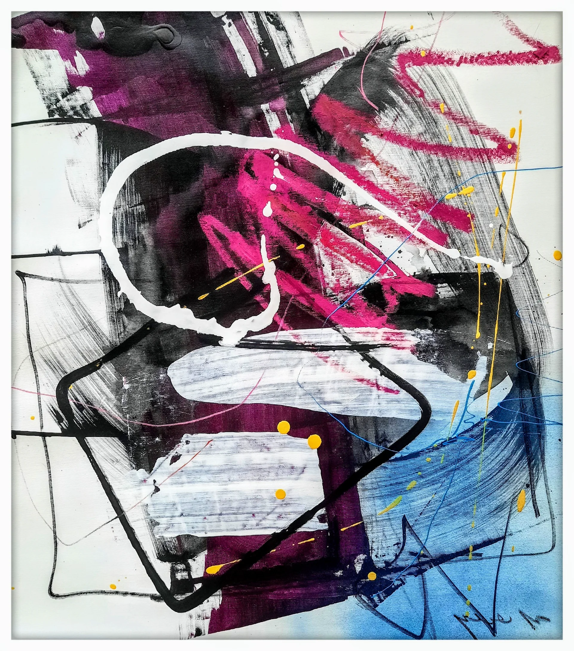 A dynamic abstract composition built through layered gestural marks, sweeping black lines, and vibrant fields of magenta, blue, white, and yellow. The work explores tension, movement, and spatial balance through expressive brushwork, drips, and graphic contrasts, creating a bold contemporary visual language.