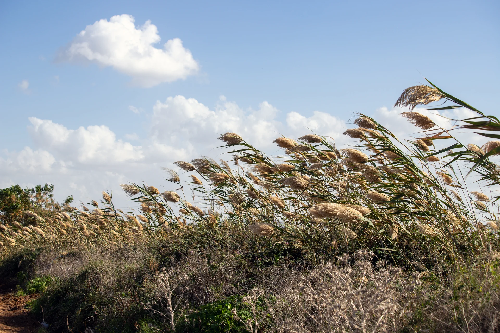 This final image captures the rhythmic movement of nature. Tall, golden reeds sway gracefully in the breeze against a backdrop of crisp blue skies and soft, fluffy white clouds