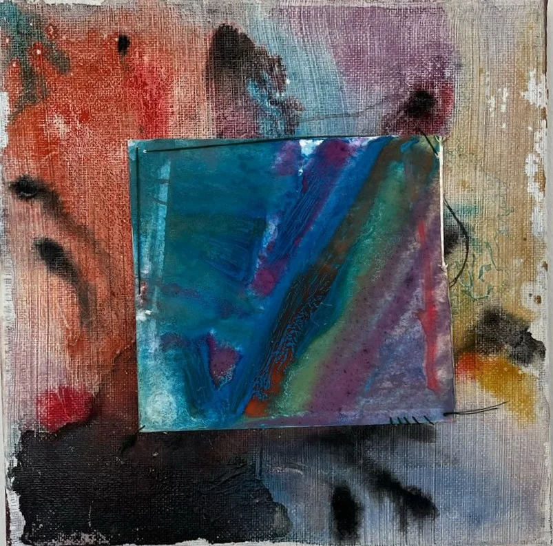 A combination of motion created by watercolor on paper sowed to canvas made with the use of watercolors and ink and acrylic on canvas and paper