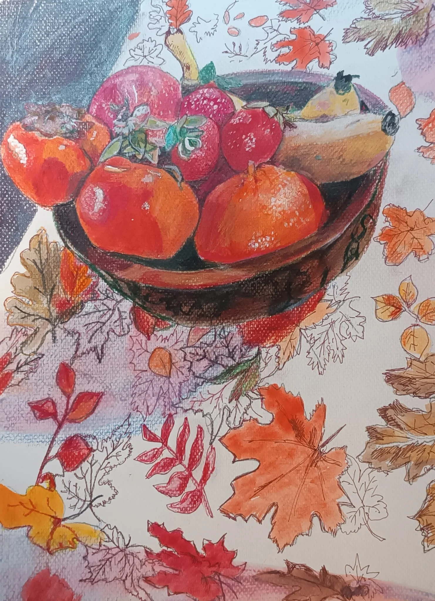 A warm and vibrant composition of autumn fruits resting on a patterned tablecloth. At the center, a dark bowl overflows with persimmons, strawberries, and apples in bold red and orange tones. The fruits are rendered using a mix of transparent watercolors and colored pencils, giving them rich depth and texture. The bowl sits atop a white cloth printed with a variety of fallen leaves in autumnal hues. The contrast between the fine ink outlines of the printed leaves and the tactile presence of the fruit creates a beautiful balance between decorative patterns and realistic form