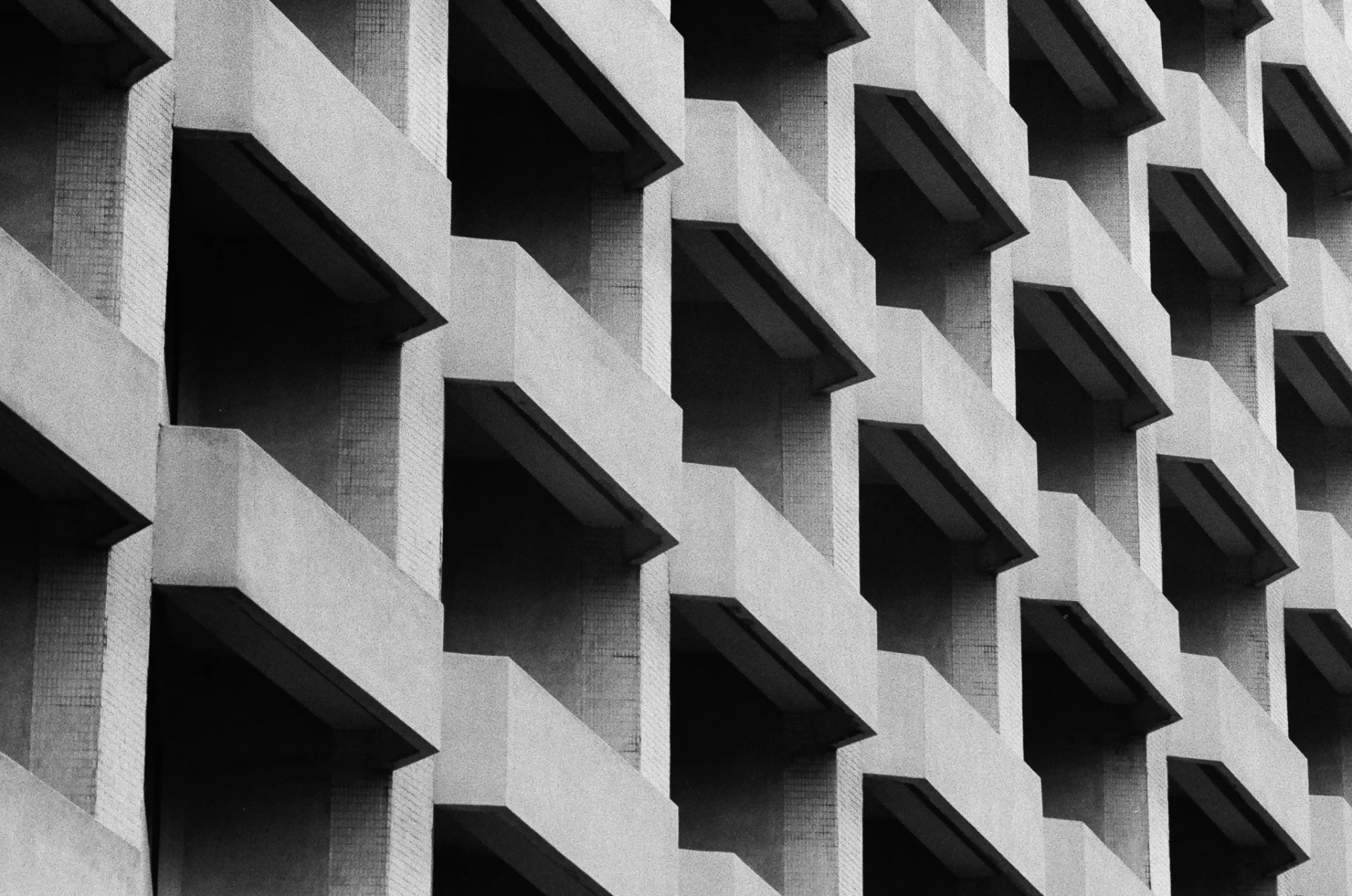 Repetition defines the structure as balconies extend outward in a precise geometric sequence. Light and shadow move across the surface, softening the rigidity of the concrete and revealing a quiet visual rhythm. Photographed on black-and-white film, the image transforms urban architecture into an abstract composition where order, scale, and repetition shape the experience of the built environment.