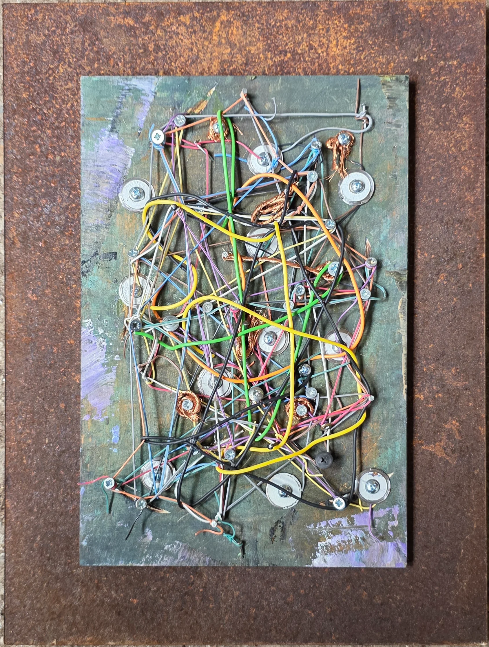 A work that combines rusty iron, processed birch wood, nails, screws, and washers, which serve as a structural foundation for colorful electrical wires. These components create a physical connection system that supports and stabilizes the mass of the compositional chaos in the work.