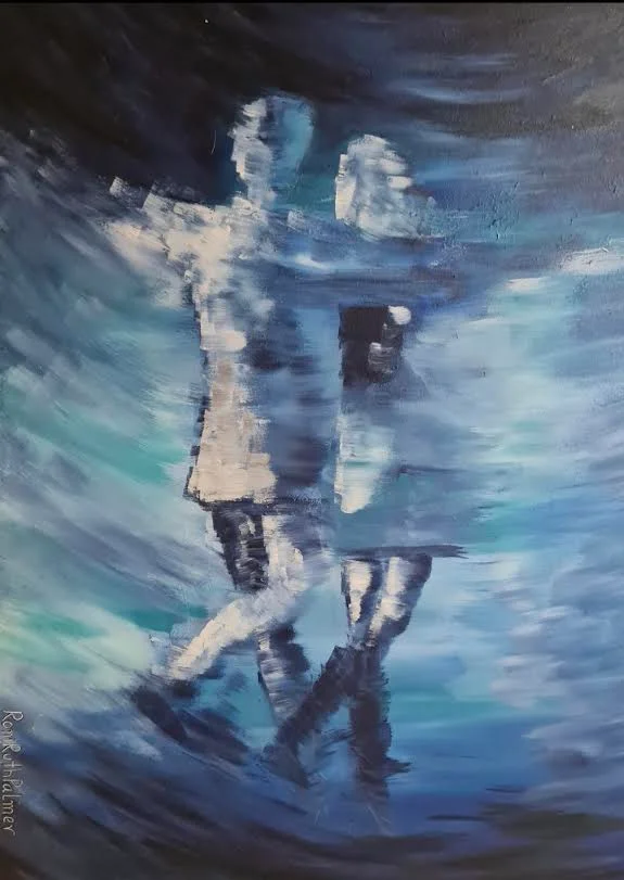 Original painting, a couple dancing in the rain. Painted in an abstract style with brushstrokes that emphasize movement, painted in only three shades, blue, white and black.