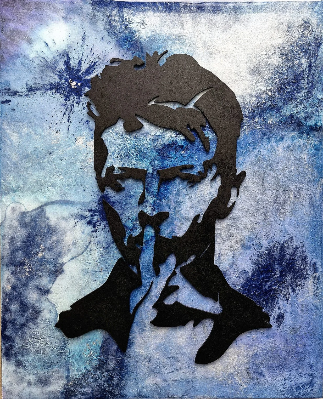 “David Bowie” is a multi-layered resin and mixed media artwork, defined by a striking silhouette of Bowie in his iconic “shhh…” gesture. With vibrant pigments and layered depth beneath, the top silhouette adds bold contrast and presence, turning the piece into a powerful homage to the legend. Created on , birch wood cradled art panel, ready to hang.