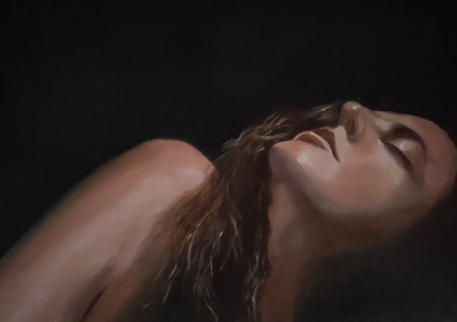 This delicate oil painting depicts the head of a young woman in a gentle recline, her eyes closed in a dreamy, serene expression. Her wavy brown hair cascades softly against a deep black background, while soft light illuminates the contours of her face, cheeks, and lips in warm nuances of pink and beige. The impressionistic technique creates a sense of fluid movement and emotional mystery