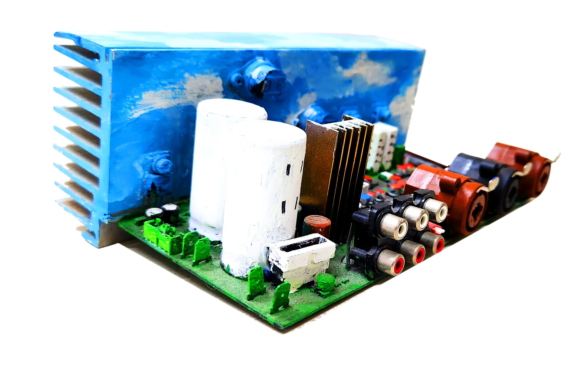 A printed circuit board of an electronic product that has become a vibrant city with streets and houses, buildings, roads, gardens, paths and cars. One look into the depths of the thing and a city comes to life