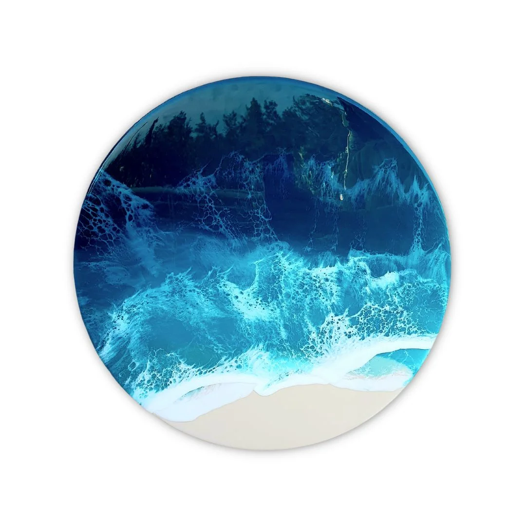A round mixed-media piece capturing the mesmerizing moment where powerful waves meet a quiet shore. Layers of resin create luminous depth and movement, preserving a single heartbeat of the ocean โ both alive and still. An artwork that invites the viewer to pause, breathe, and connect with the timeless rhythm of the sea.