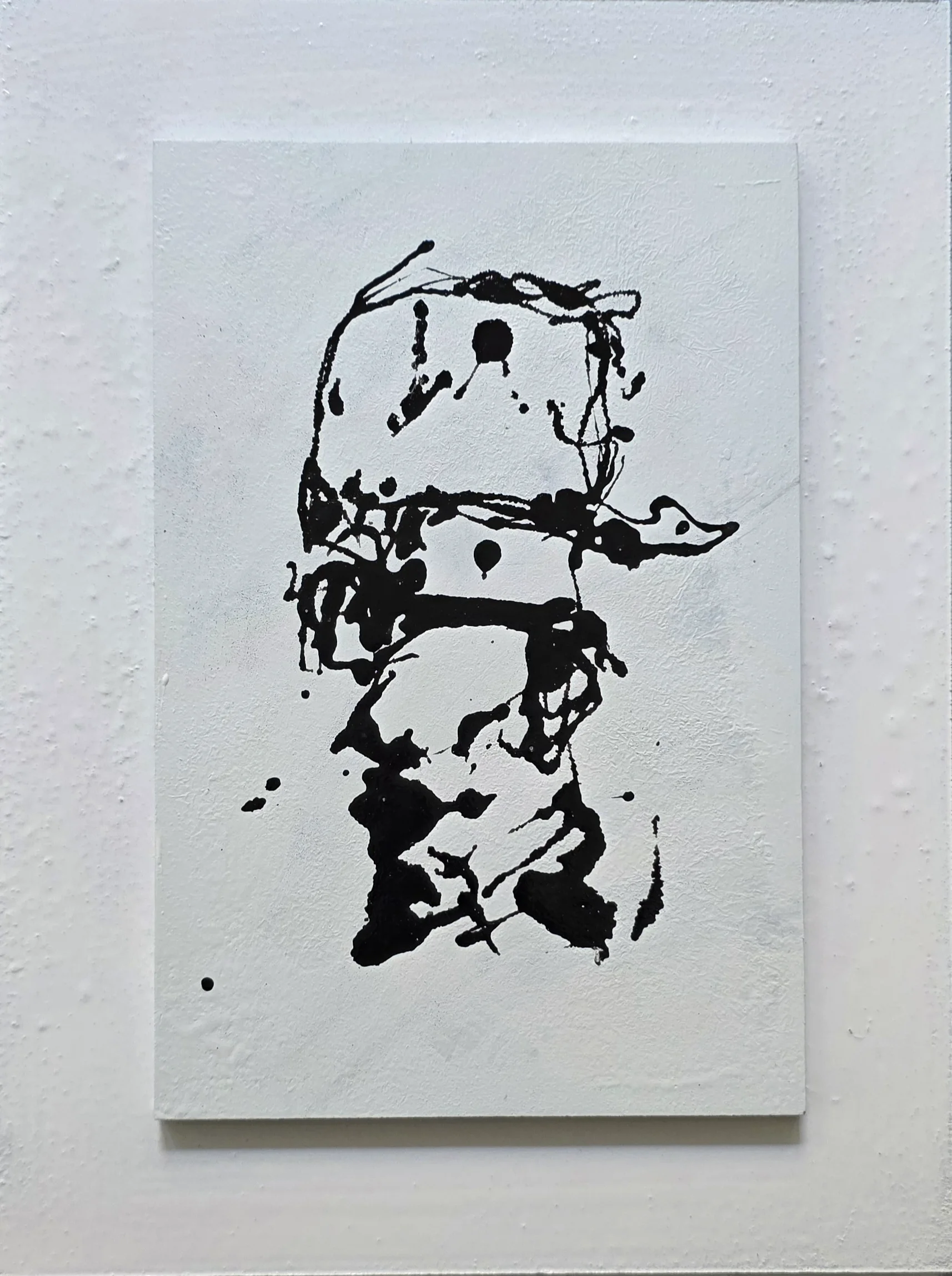 A rusted iron patella painted white with a 9mm birch patella painted white on which a two-faced figure was cast by dripping and applying