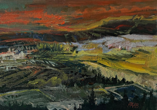 A painting that captures a vast, open field bursting with life and color. The overall effect is one of abundance and harmony—a celebration of nature’s palette, where every color feels alive yet balanced within the scene. Above, the sky is painted in soft warm oranges near the horizon. Subtle shadows add dimension, and distant hills or mountains may peek through, their muted colors contrasting with the vibrancy of the foreground.