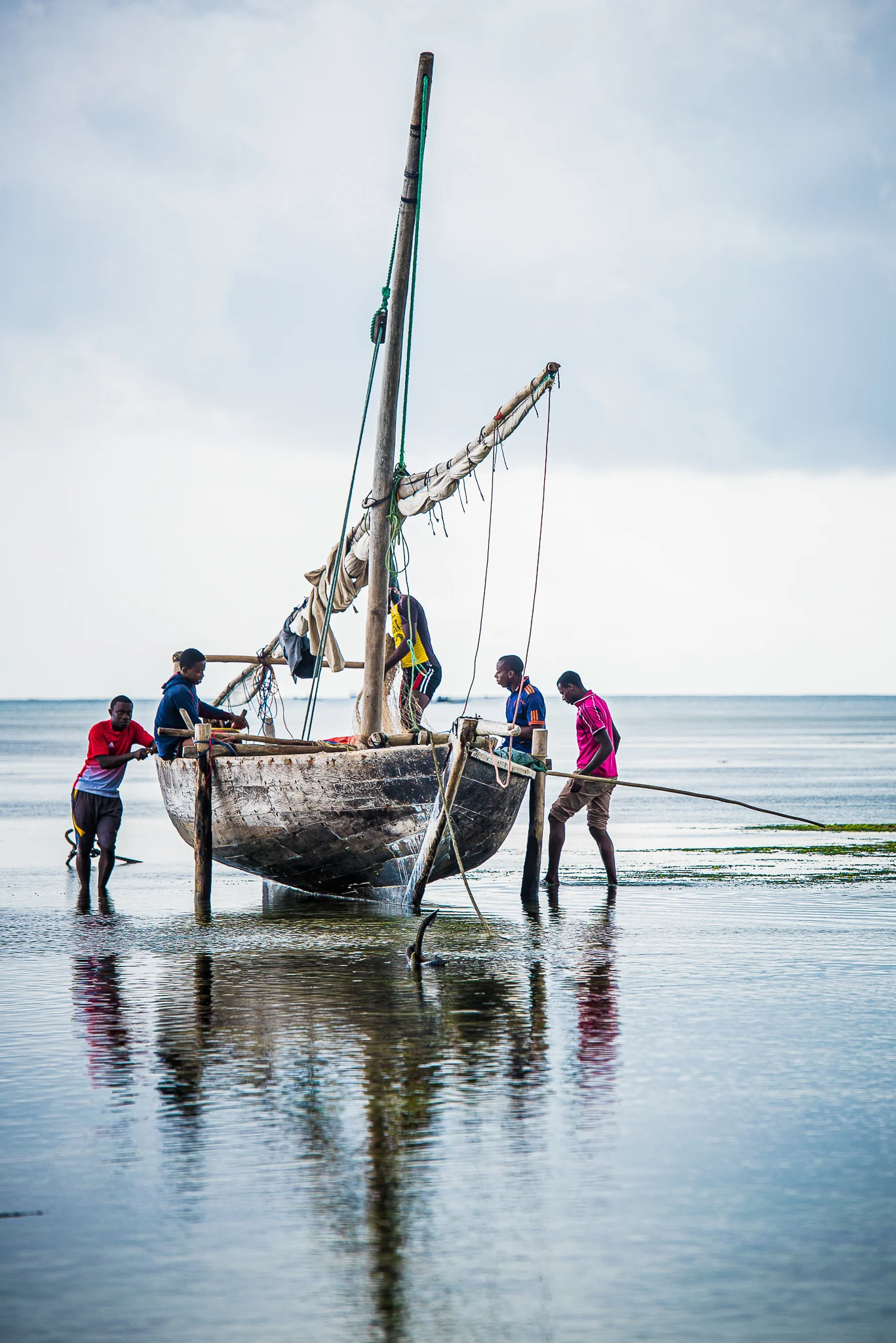 A documentary-style photographic work capturing fishermen guiding a traditional wooden boat through shallow coastal waters. The composition emphasizes reflection, balance, and daily labor, with soft natural light and a restrained color palette enhancing the quiet atmosphere.