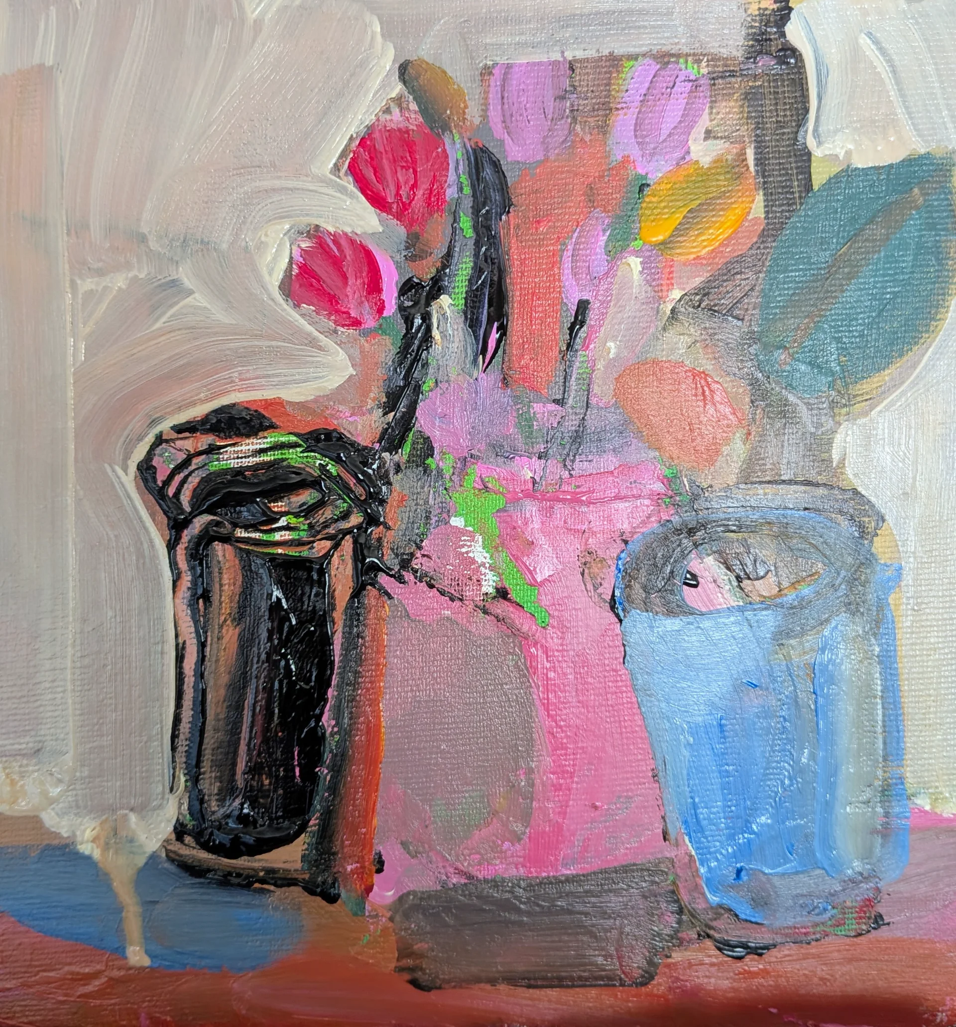 An expressive still life featuring flowers, a dark bottle, and two glasses, painted with loose gestural brushwork and a vibrant palette of pink, blue, and earthy tones. The composition balances abstraction and observation, creating an intimate domestic scene rich in texture and movement.