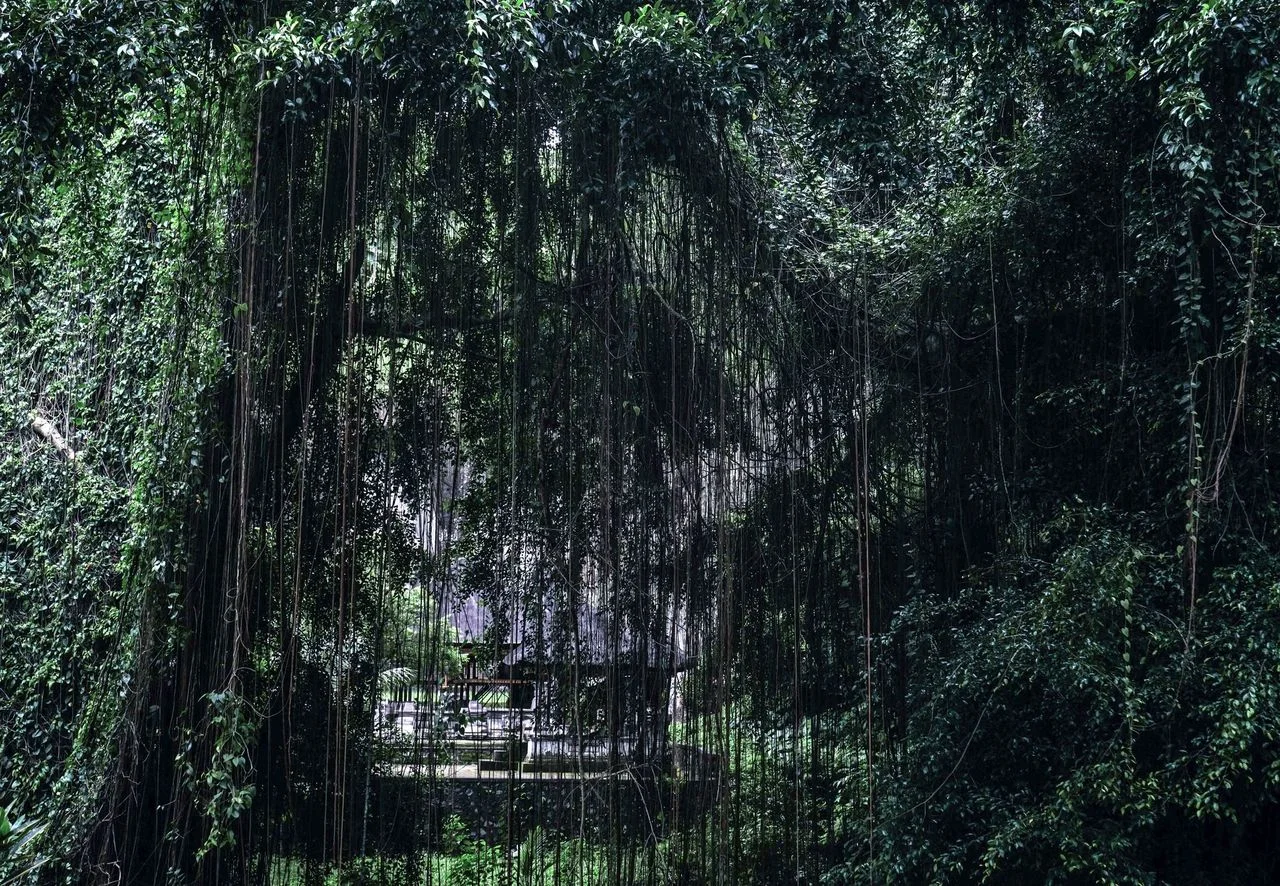A natural forest veil in the midst of a temple complex near Ubud, Bali, Indonesia. This image depicts an instance of synergy between the human and natural worlds that characterizes Balinese culture.