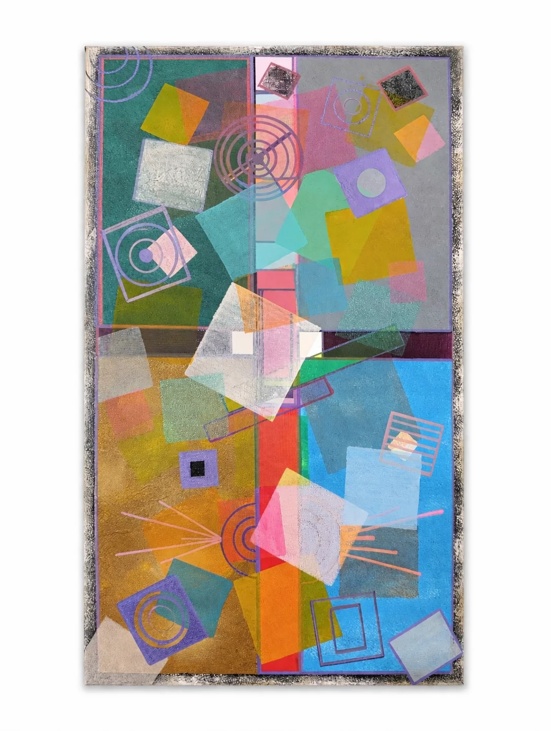 A layered geometric composition where structure meets fluid motion. A central axis both divides and unifies contrasting color fields—cool versus warm, calm versus energetic. Floating shapes overlap in translucent harmony, creating depth and a sense of suspended movement, capturing a moment within an ongoing process of balance and transformation.