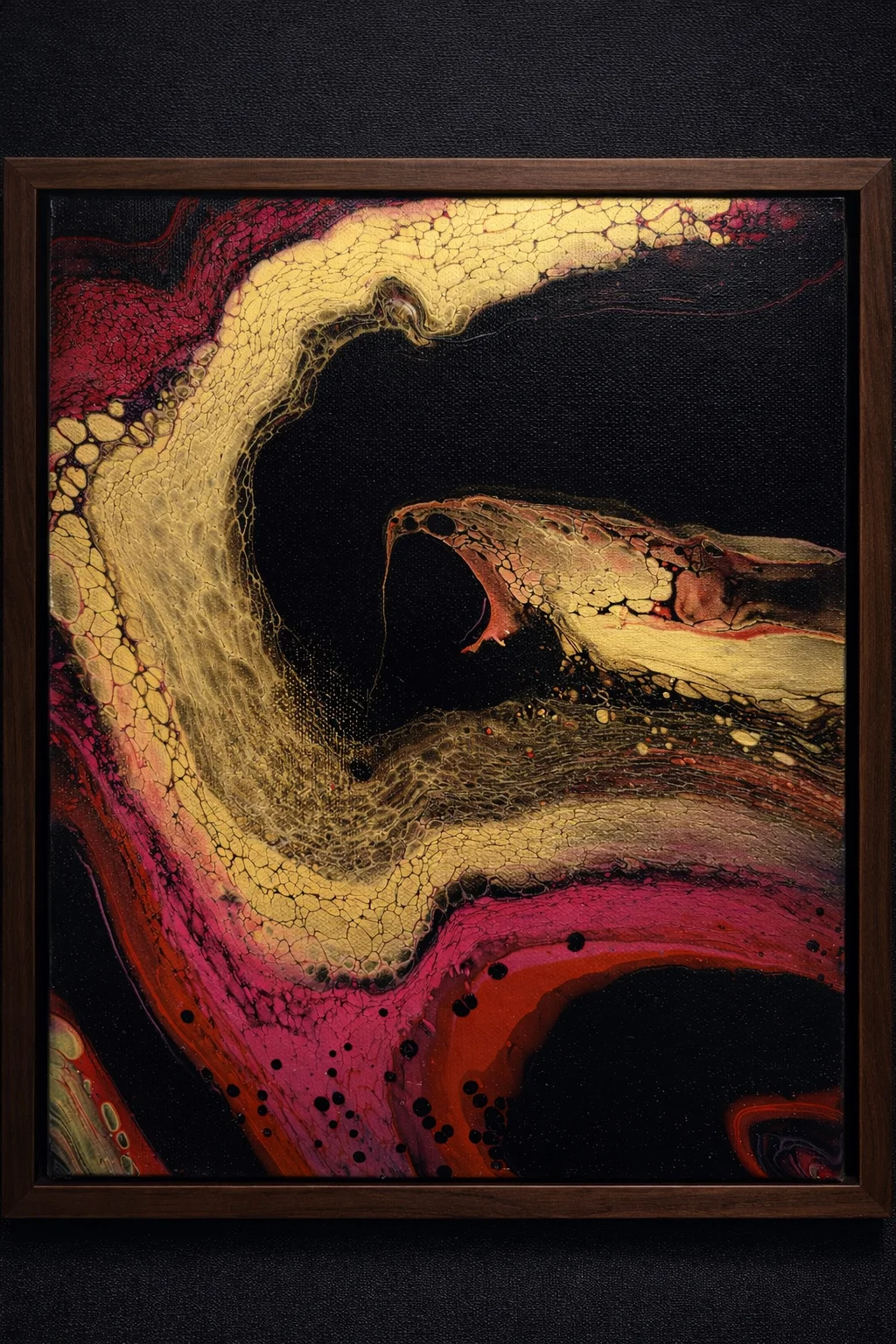 From currents of black and rivers of gold, a serpentine presence emerges to guard a hidden passage. Living cells and burning reds create tension, mystery, and revelation. The closer you look, the more the story unfolds.