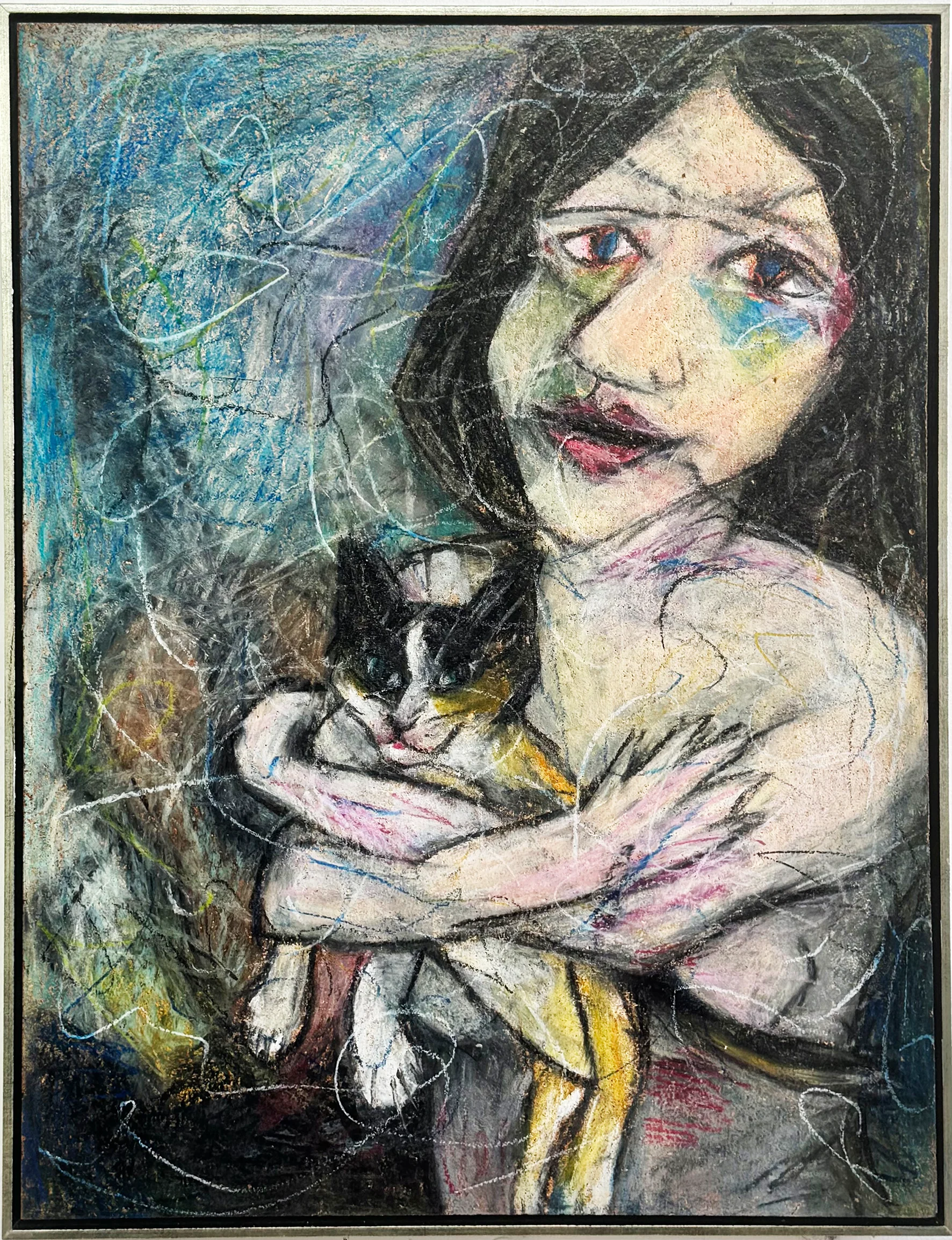 Girl hugging a cat - freehand pastel chalk drawing, framed in a silver-plated wooden frame