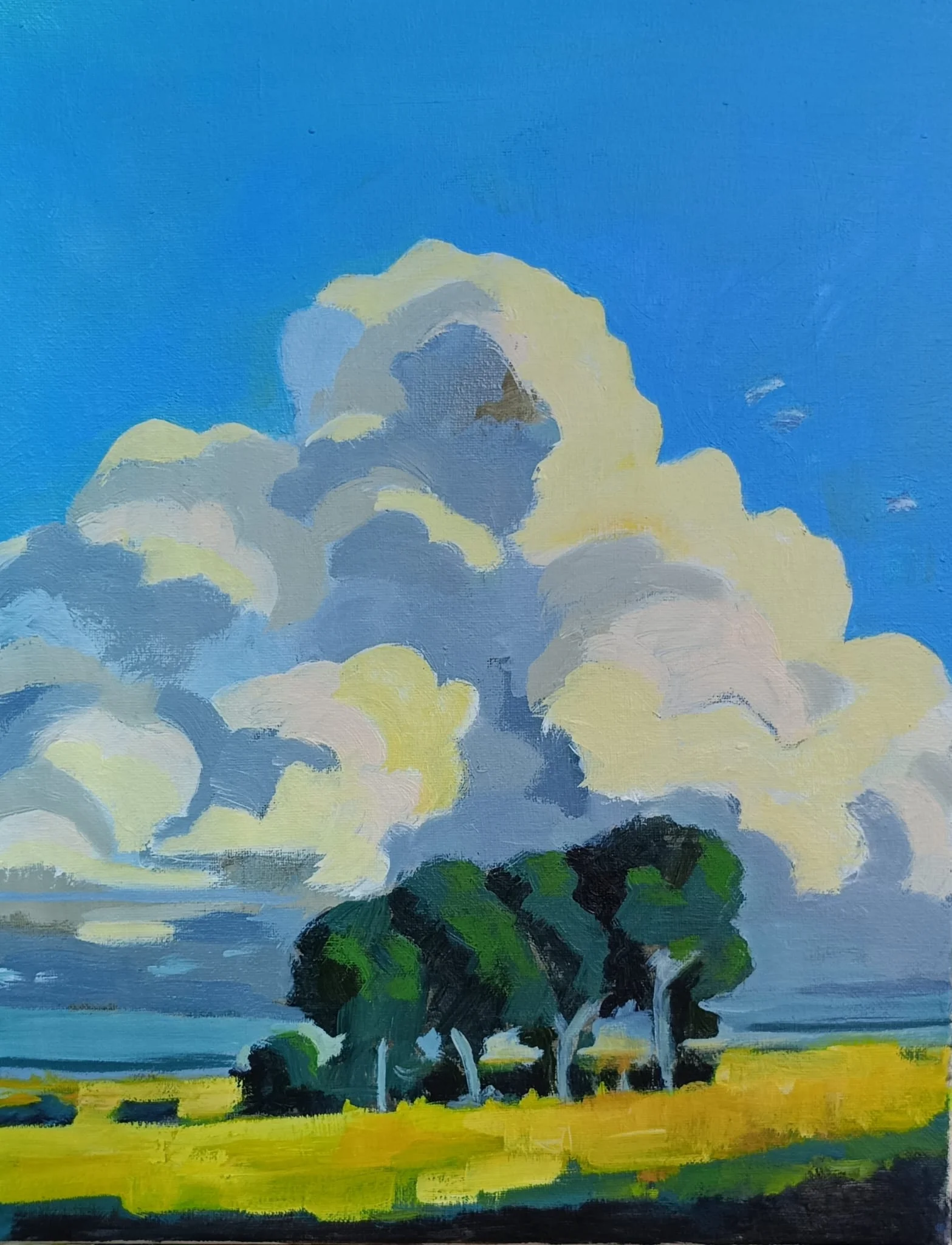 Colorful, towering clouds cast a golden light over a wide open field, while a line of green trees anchors the scene. The contrast between the dramatic sky and the calm land creates a feeling of a suspended, timeless moment.