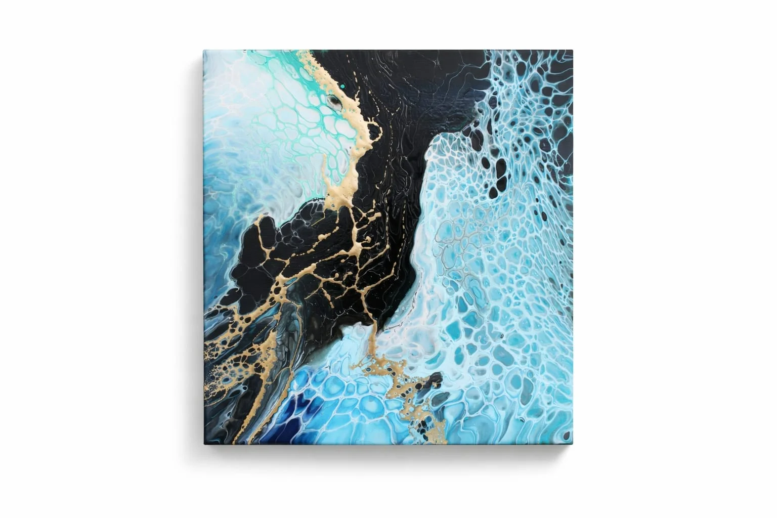 A captivating abstract fluid art piece featuring a dramatic contrast between deep black and vibrant turquoise. Intricate gold accents emerge from the layers, creating a stunning 3D effect that adds a touch of luxury to any room. The detailed cell structures highlight the organic movement of the paint, offering a perfect balance of energy and serenity.