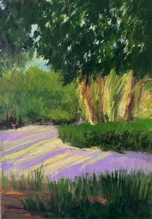 The Golden Path describes a gently winding path stretching from the foreground into the distance, its surface bathed in warm, golden sunlight that seems to shimmer with every step. The light creates soft highlights and subtle shadows along the path, giving it a textured, almost radiant quality. In the background, a cluster of lush green trees stands in quiet contrast to the golden path. Their leaves are painted in multiple shades of green—deep forest, bright emerald, and hints of yellow where the sunlight touches them—adding depth and vibrancy. The overall feeling of the painting is warmth, tranquility, and the quiet promise of a journey toward nature’s calm embrace.